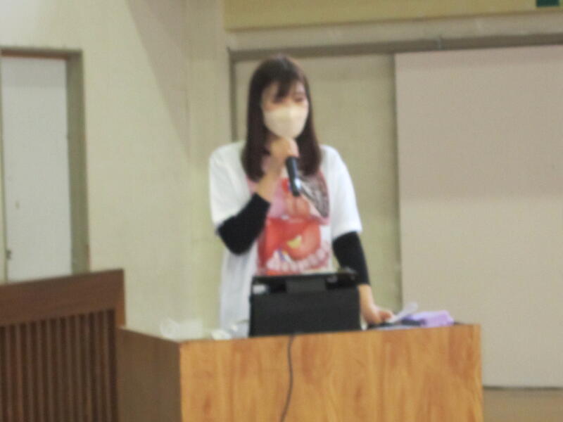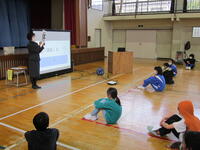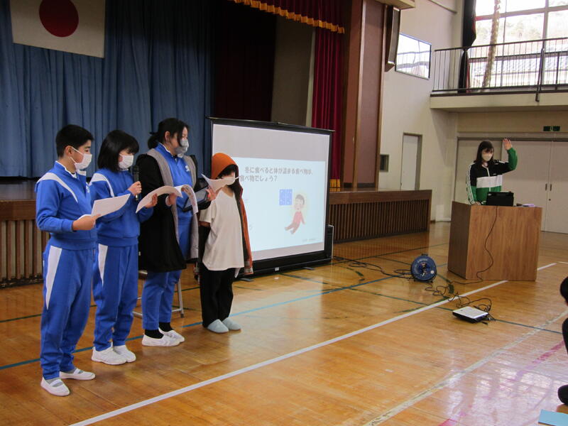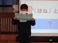養護教諭の椛澤先生と健康委員会から、「骨と姿勢」「かぜの予防」についてお話がありました。椛澤先生からは、骨には体を守ったり支えたりする働きがあることなど、体の骨や臓器がプリントされたTシャツを着て具体的にお話がありました。また、健康委員会からは、かぜの予防に大切なことについてクイズ形式で発表がありました。かぜの予防に努め、背筋を伸ばして、これからも元気に登校してください。