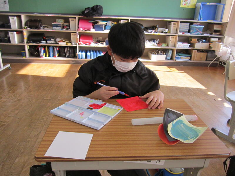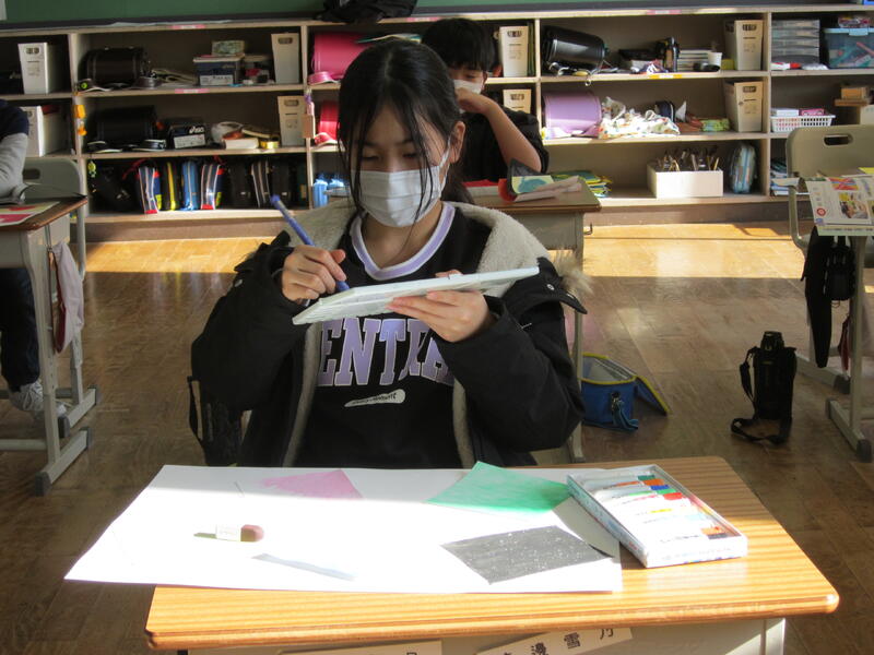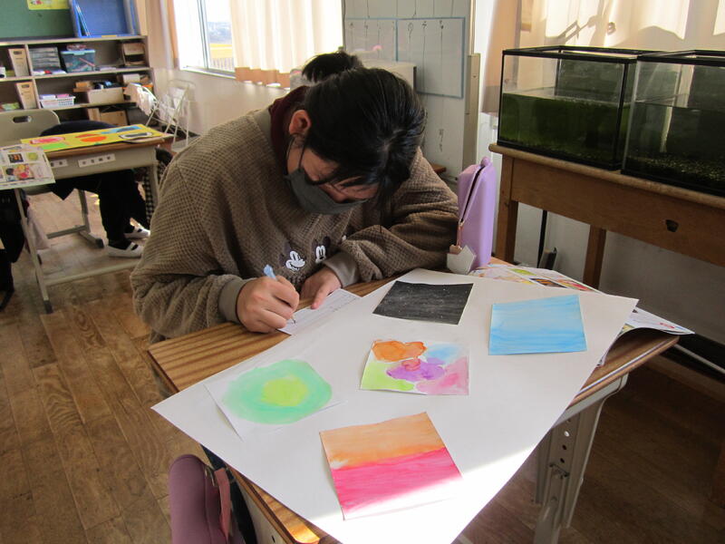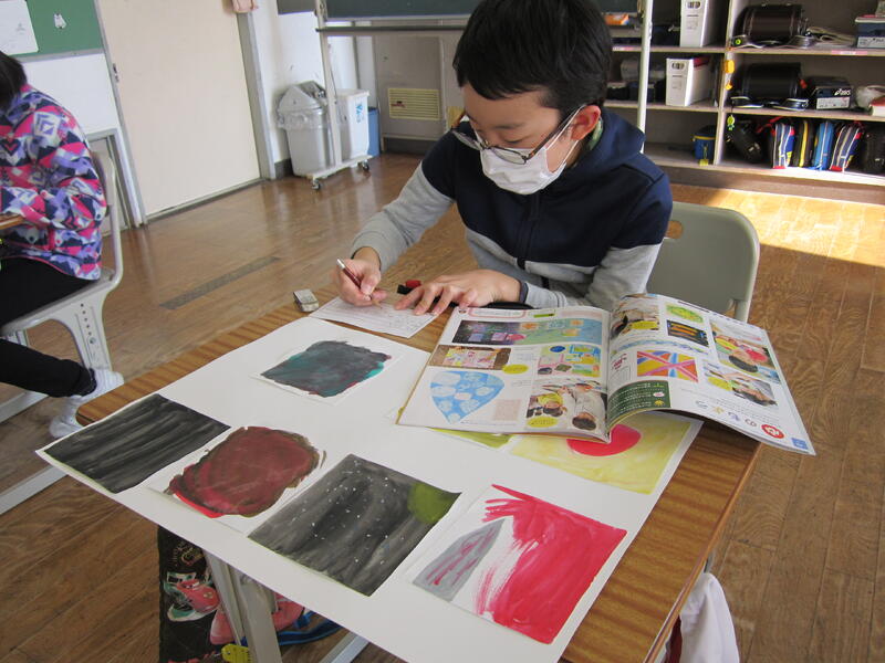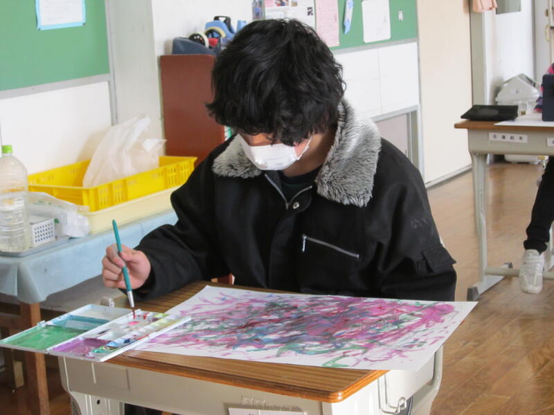 5・6年生が図工の時間に、絵の具を使っておもいのままにかいた形や色から、いろいろな気持ちを見つけたり、今の気持ちを絵の具を使って表現したりしていました。楽しい気持ち悲しい気持ちなど、形や色を工夫して表現していました。