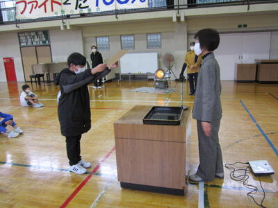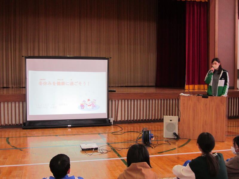 次に、養護教諭から「冬休みを健康に過ごそう」についてお話がありました。「食べすぎに注意」「早寝早起き」「感染症対策」についてのお話や効果的な体操を教えていただきました。よく守って楽しい冬休みにしてください。