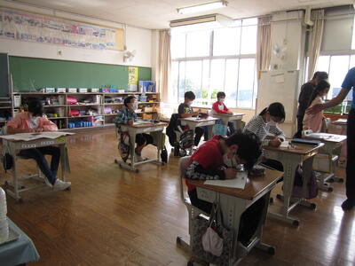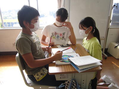 6年生は、算数の時間に「円の面積の求め方を考えよう」の学習をしています。今日は、色を塗った部分の面積の求め方について学習をしていました。自力学習の後、友達と意見を交換し、自分では気付かなかったことに気付いたり、説明することで理解が深まったりしていました。本校は、少人数・複式学級での良さを生かしながら、子どもたちがスモールティーチャーとなり自主的に学習を進めています。
