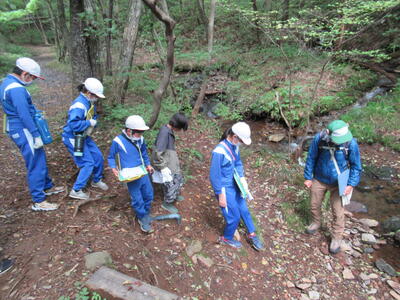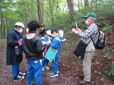 もりの案内人の方と一緒に森林を探検し、いろいろな木々や草花について説明をしていただきました。