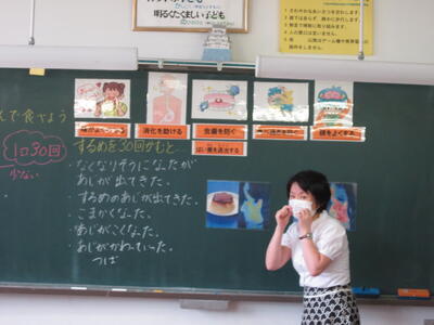 本日、北部給食センター栄養教諭の本田先生が来校され、よくかんで食べることについてお話をしてくださいました。よくかんで食べると「味がよくかわる」「消化を助ける」「虫歯を防ぐ」「食べすぎを防ぐ」「頭をよくする」効果があるそうです。今週は、かみかみ週間として、めあてを立てて実行していきます。よくかんで栄養をしっかりとりましょう。