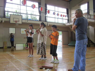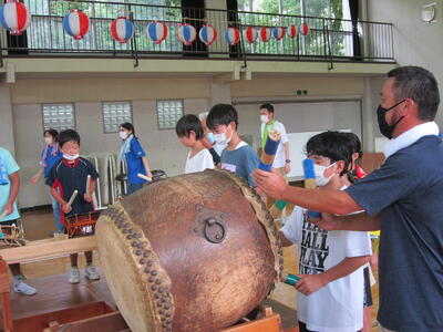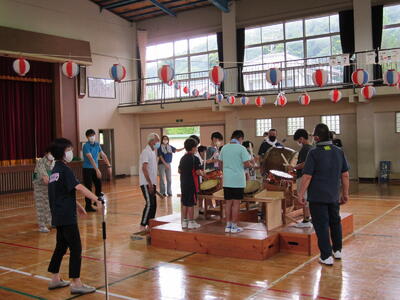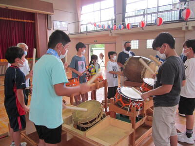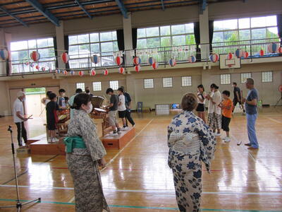 盆踊りでは、「ちいきのつどい」で教えてくださった講師の方(5名)にもお越し頂きました。お囃子の演奏は、とても上手だとほめられました。保護者・教職員みんなでお囃子に宇合わせ中野盆踊りを踊り、夏祭りを満喫しました。