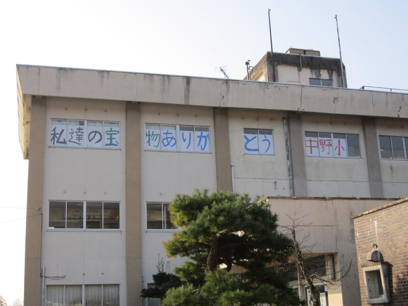 閉校を控えて、中野小学校の思いを、校舎2階(南側)と3階(北側)の窓に張り出しました。張り出したメッセージは、全校生で考え決めました。6年生が下書きし、3年生から5年生が色を染め、3月7日に張り出しました。早速、地域の方から「子どもたちのメーセージに涙がでました」「来年度もがんばってほしい」といったエールをいただきました。