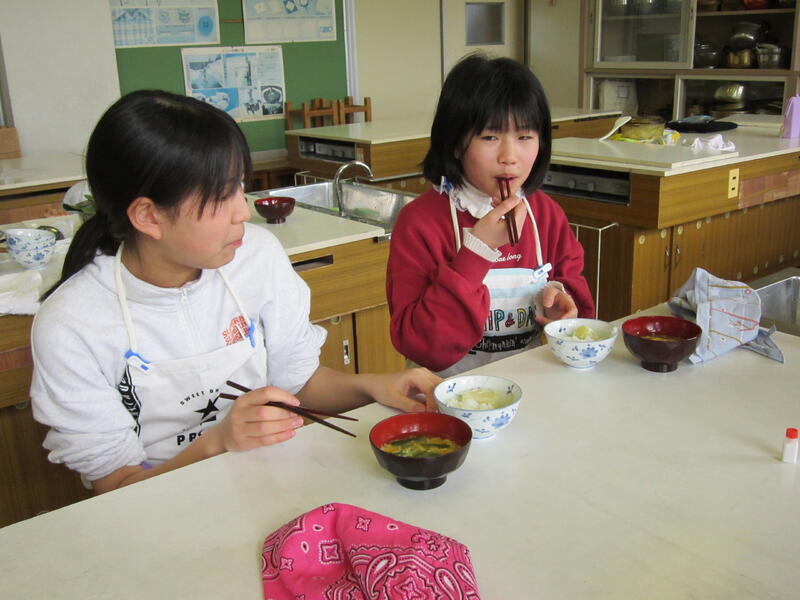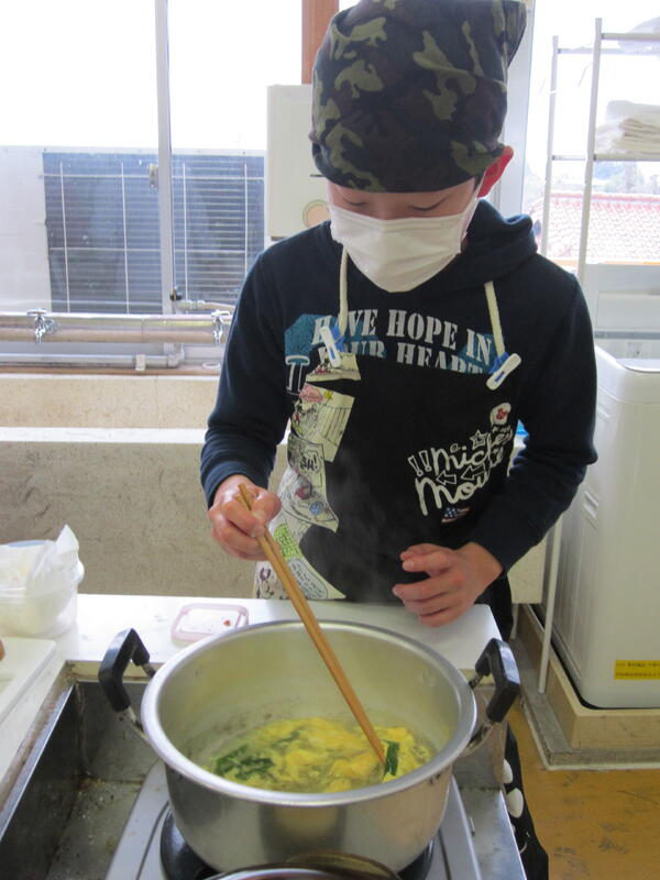 3月10日高学年の8名が、調理実習を行いました。献立は、ご飯、みそ汁、ゆで野菜です。米を炊く火加減やみそ汁の具の入れ方など、みんなで相談しながら進めていました。ご飯は、こがさずおいしく炊けました。みそ汁は、具材がたっぷりで栄養満点でした。青菜のおひたしも彩りよく上手にできました。