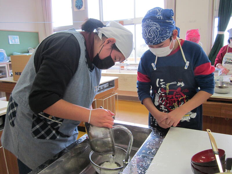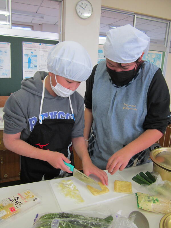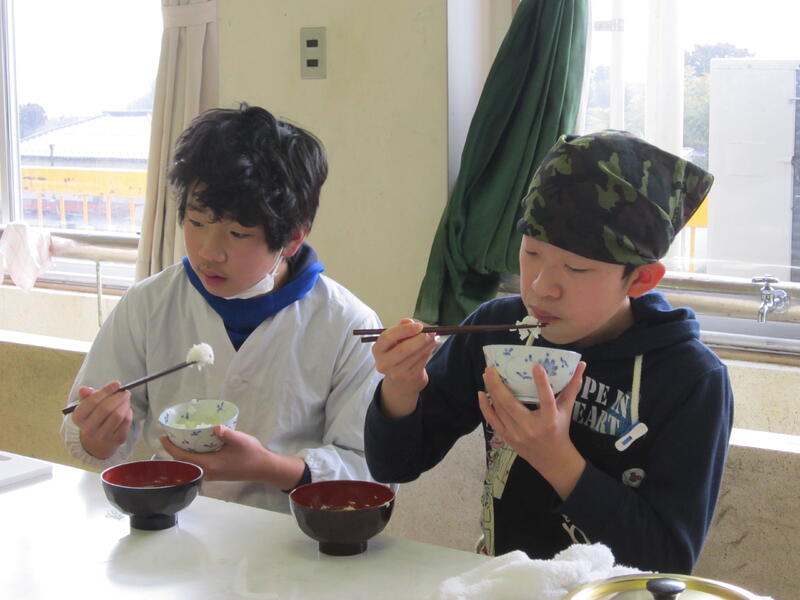 2023年3月10日 11時02分3月10日高学年の8名が、調理実習を行いました。献立は、ご飯、みそ汁、ゆで野菜です。米を炊く火加減やみそ汁の具の入れ方など、みんなで相談しながら進めていました。ご飯は、こがさずおいしく炊けました。みそ汁は、具材がたっぷりで栄養満点でした。青菜のおひたしも彩りよく上手にできました。