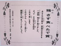 2023年2月13日 12時35分生涯にわたって健康で充実した生活を送ることができるように、自らの食生活に興味・関心を持ち、正しい食事の知識と望ましい食習慣を身に付けた児童の育成を図っています。その成果により、「ふくしまっ子ごはんコンテスト」において学校賞をいただきました。また、北部給食センター様からは「残さず食べたで賞」をいただきました。これからも、3食規則正しく、栄養のバランスを考えて食事をとり、感謝する心を育んでいきたいと思います。