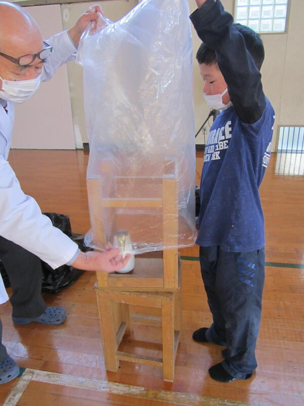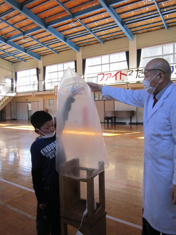 2月7日(火)、4年生の理科の授業「もののあたたまり方」で、空気のあたたまり方について学習しました。体育館で、空気をドライヤーで温めビニール袋に集めました。いざ手を離すとバランスが崩れうまく上がりませんでした。ビニール袋が重いこととバランスをとる工夫が必要だったようです。今回の課題を次に生かし学習しましょう。サポートティチャーの鈴木先生には、これまで楽しい実験をたくさんしていただき、ありがとうございました。