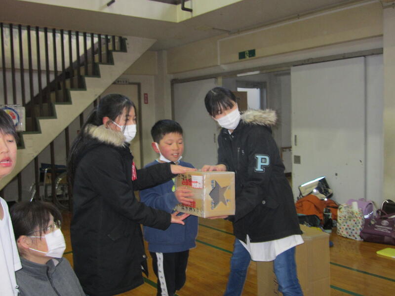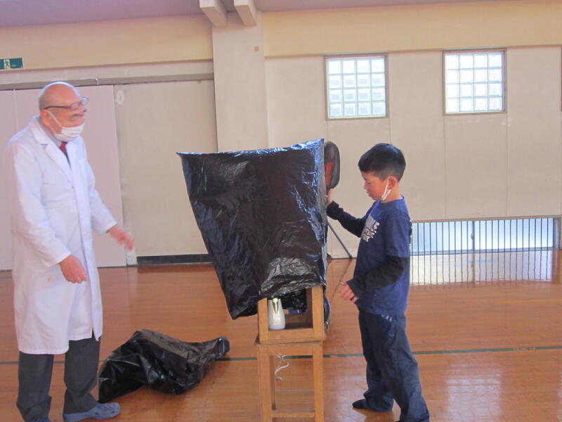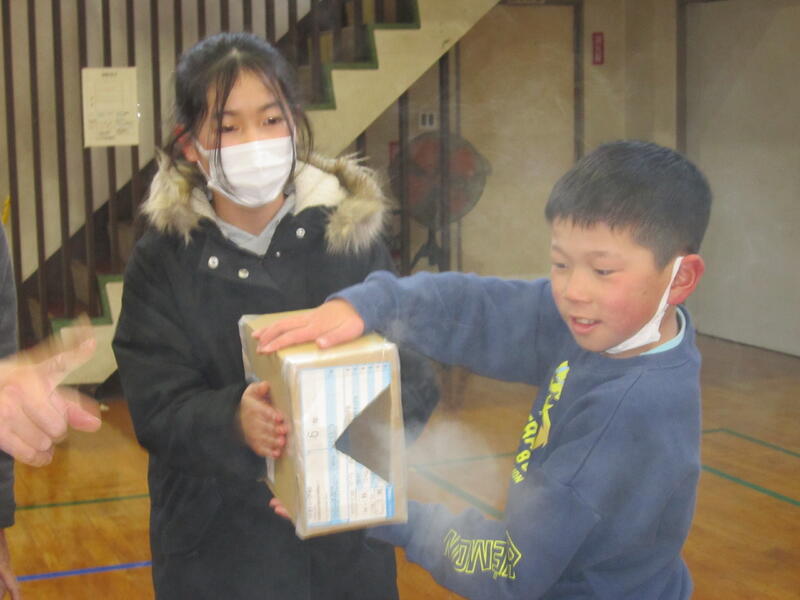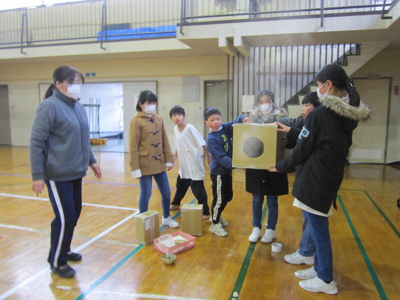 本日、クラブ活動で空気砲の実験をしました。段ボール箱に煙をため、箱の側面を強くたたきます。すると、丸や三角、星形など、いろいろな形の空気砲が発射されました。子どもたちは、歓声をあげ連射していました。