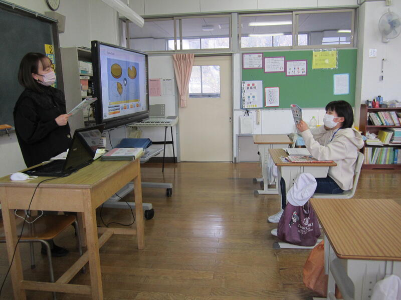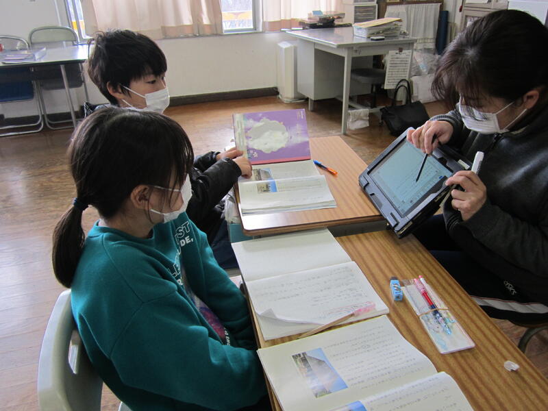 教室の片方では、3年生がタブレットを使って国語の学習をしていました。いろいろな方のサポートをいただきながら、複式学級での学習活動の充実を図っていきます。