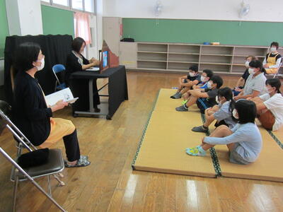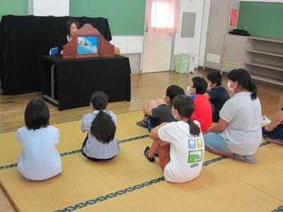 2022年6月30日 15時10分読み聞かせボランティアの方々のお話会が開かれました。読み聞かせボランティアの方々が、とっても上手に紙芝居や絵本の読み聞かせをしてくださいました。子供たちは、主人公になり変わったり、思わず感想をつぶやいたり・・・お話の世界に入り込んで、物語の面白さを味わっていました。読み聞かせボランティアの方々には、本当に感謝いたします。ありがとうございました。