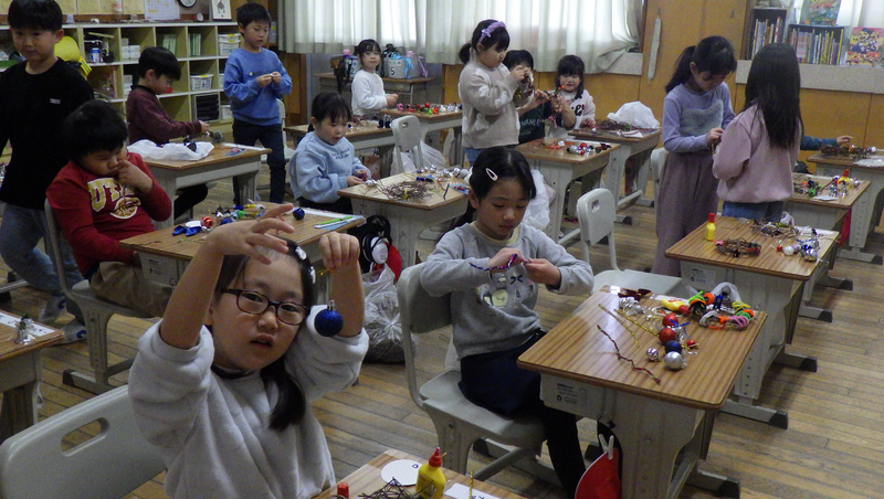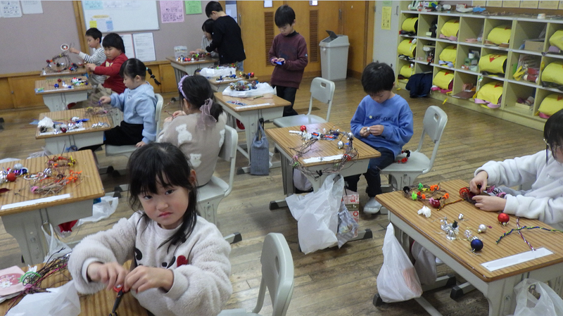 6日(金曜日)教室で1学年の子どもたちが、図画工作科の授業「いっぱい使って何をしよう~クリスマスリースづくり~」をしました