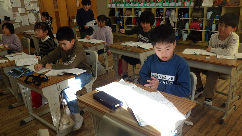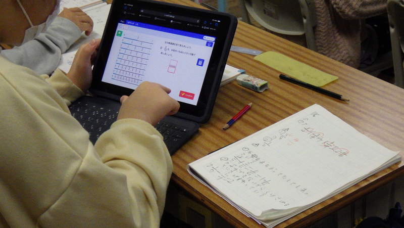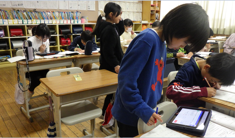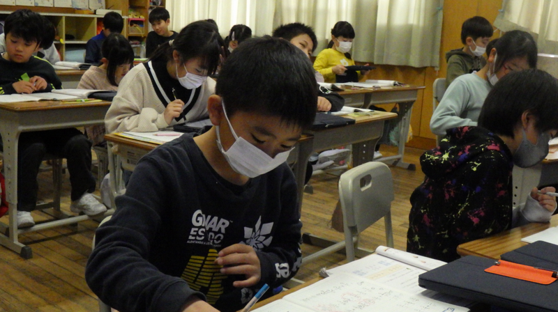 算数科の授業で熱心に学ぶ3学年・4学年の子どもたちでした。