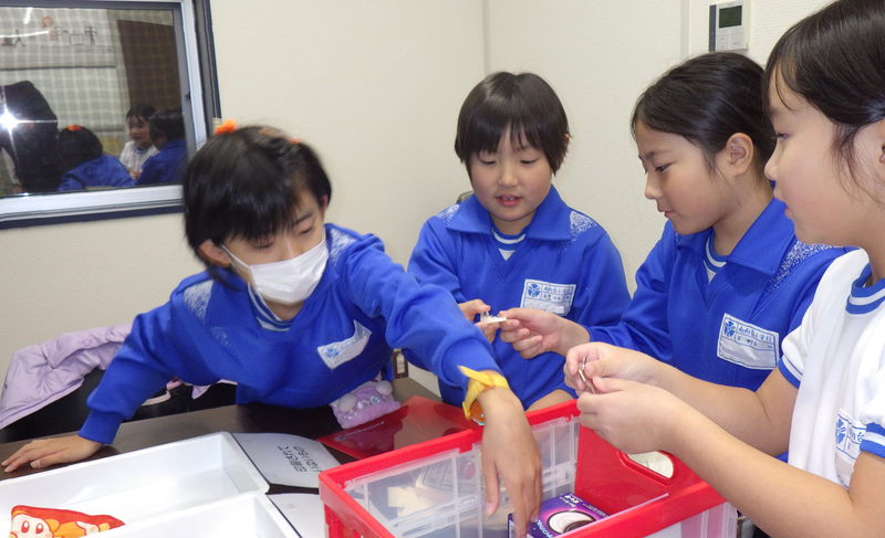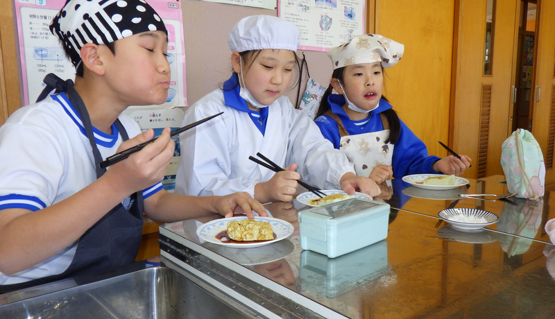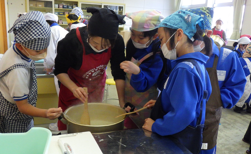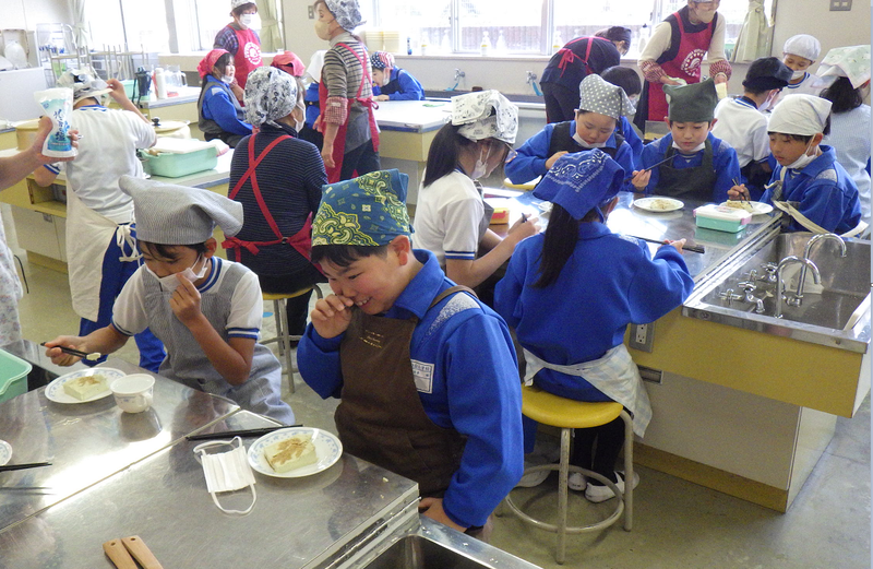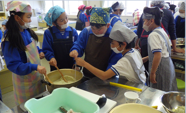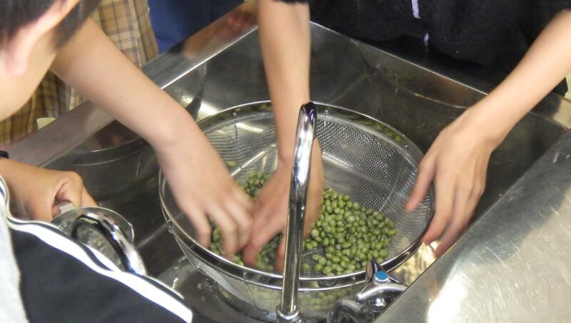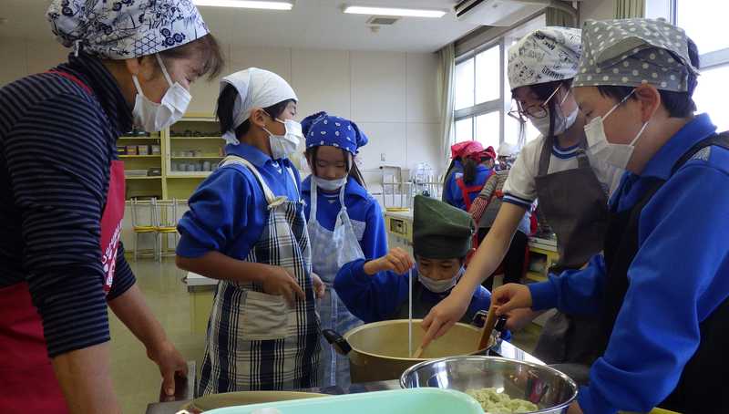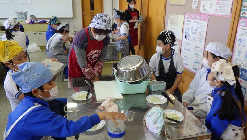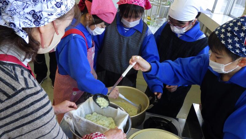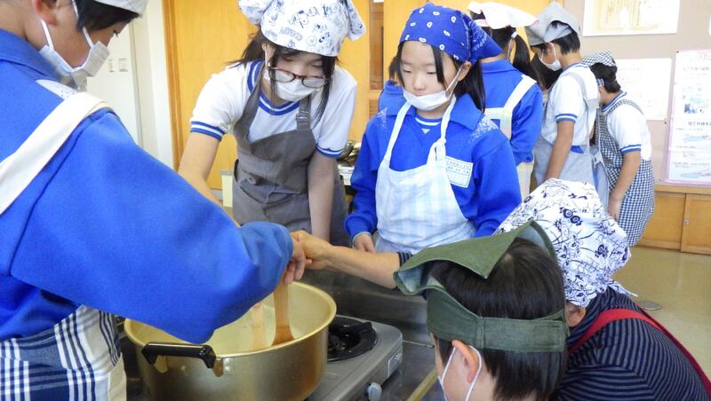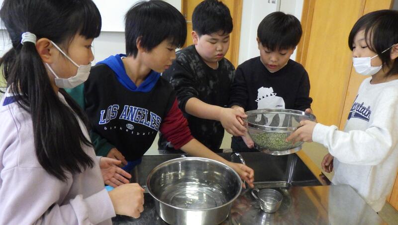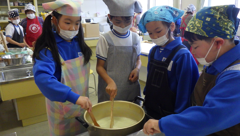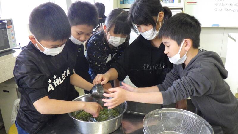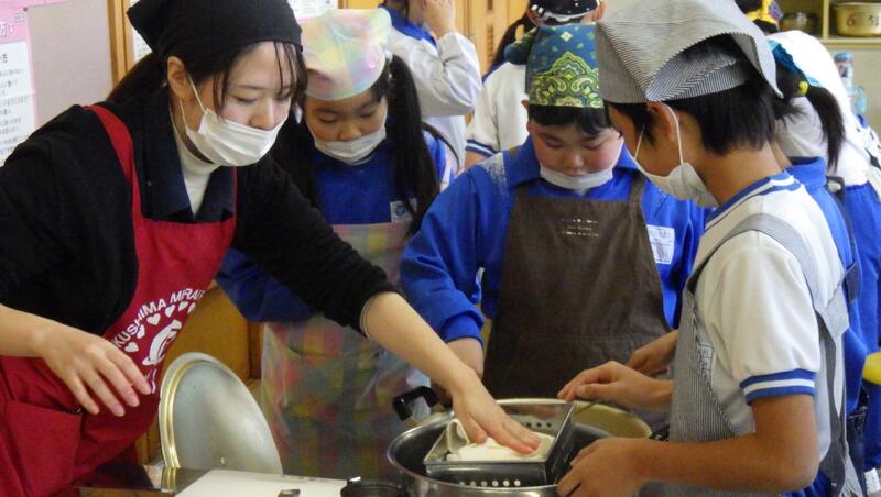 19日(火曜日)家庭科室で4学年の子どもたちが『豆腐作り体験』に取り組みました。