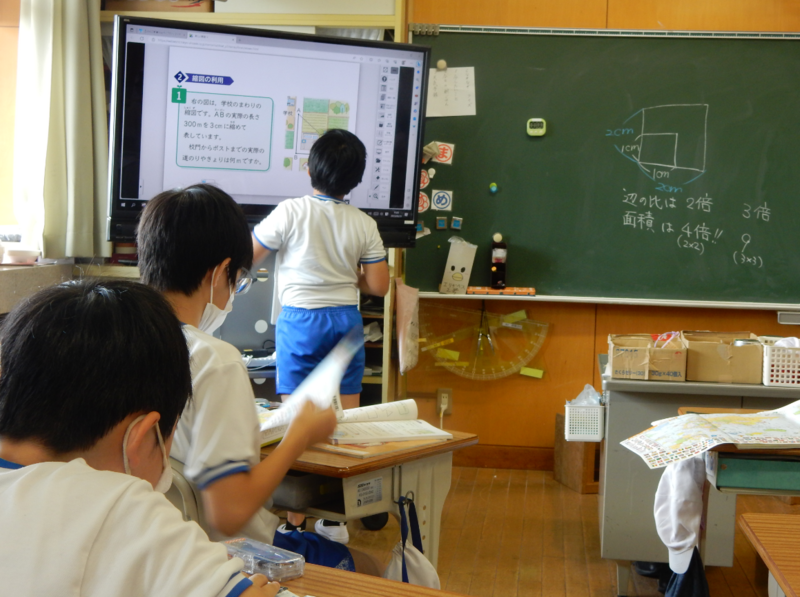 2023年8月29日 16時30分形が同じで大きさが違う図形の面積や地図上の長さと実際の距離などを計算で求めています。