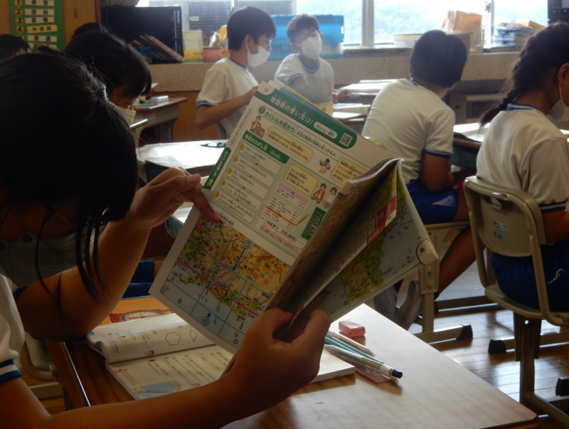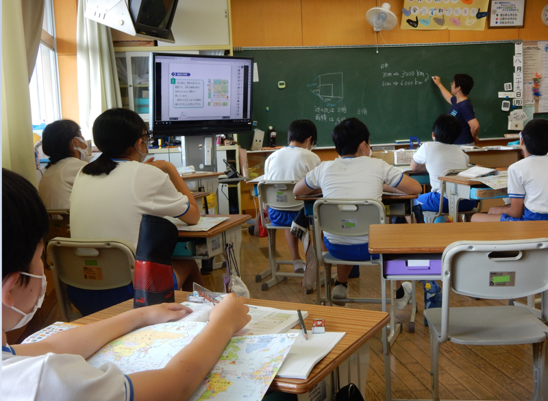修学旅行の目的地までの直線距離を縮尺を使って求めています。小学生の地図帳では、縮尺を【比率】(例 1:10000)で表しています。【分数】は使われていないようです。