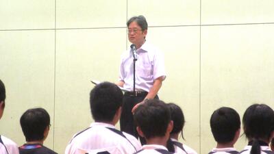 全校生徒が体育館に集まり、選手たちを激励しました。