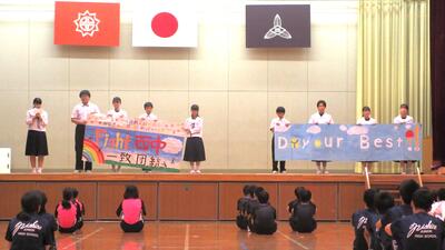 在校生からの応援では、文化部員たちが作成した横断幕とともに、