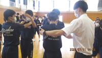 不審者に腕をつかまれた時の護身術を、講師の指導を受けながら練習する西根ユースたち。