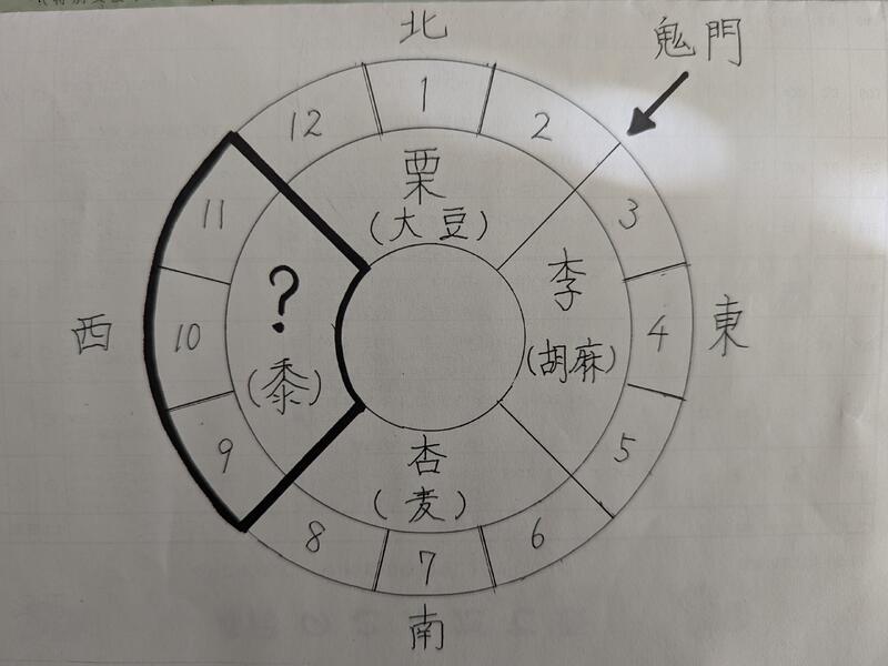 今年の「その続き」は、同じく十二支の表(五穀・五果含む)を使って、「なぜ"杏"太郎や"栗"太郎ではなくて、"桃"太郎だったのか?」