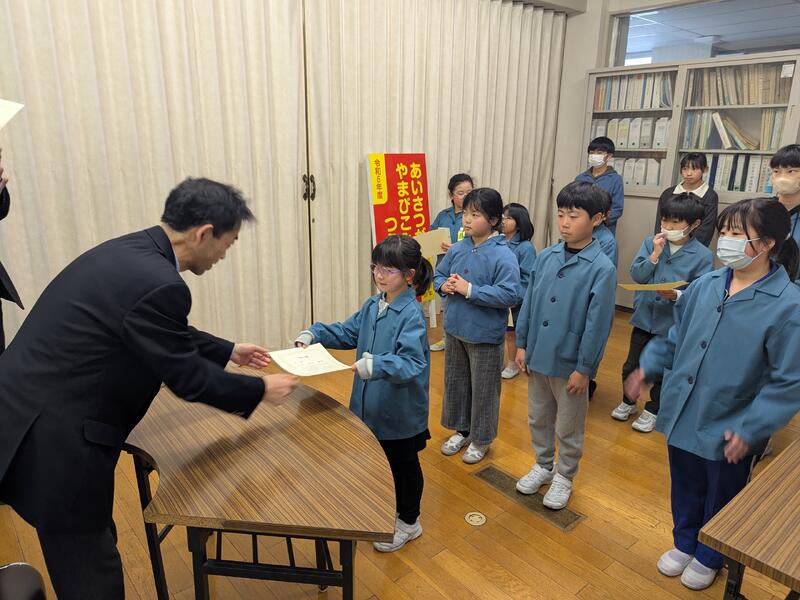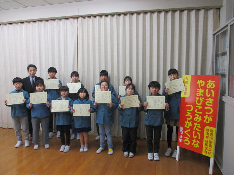庭坂地区青少年健全育成標語コンクール入賞者が、推進会長さんから表彰を受けました。
