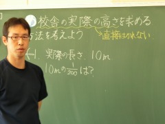 6年生は、実測できない校舎の高さなどを、どうやって求めることができるのかを、考える算数の授業を行っていました。