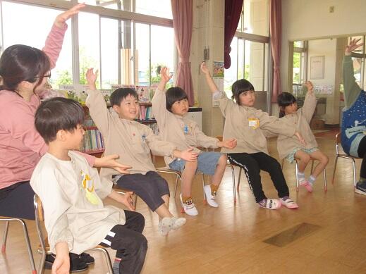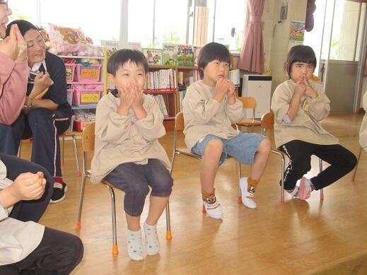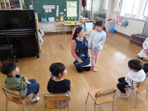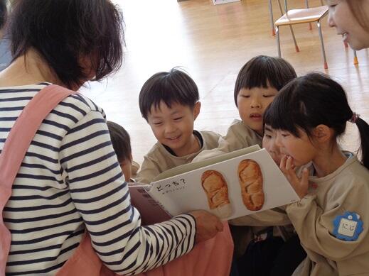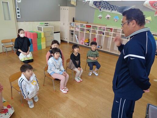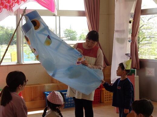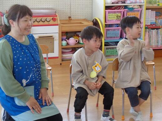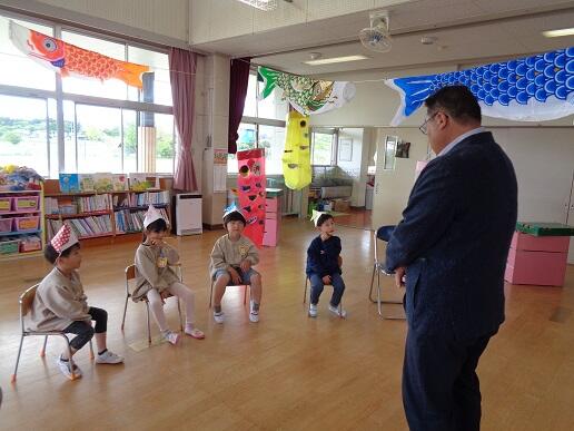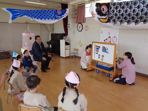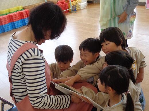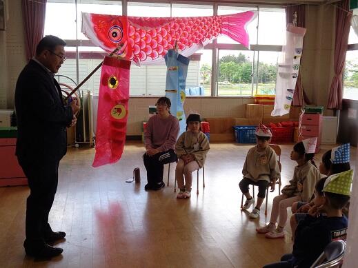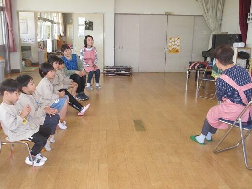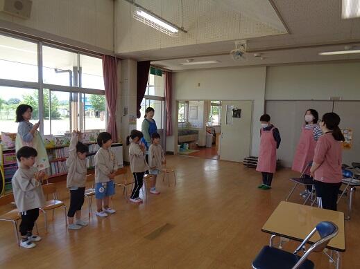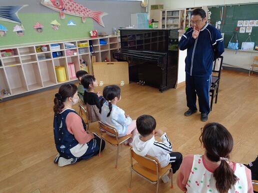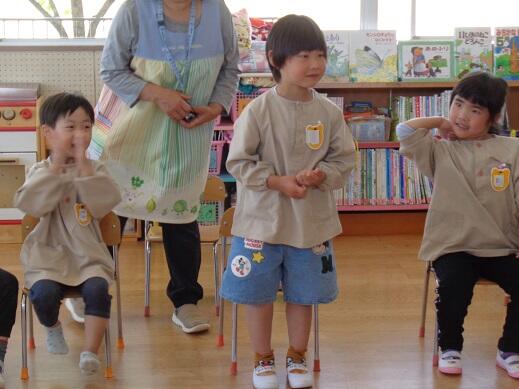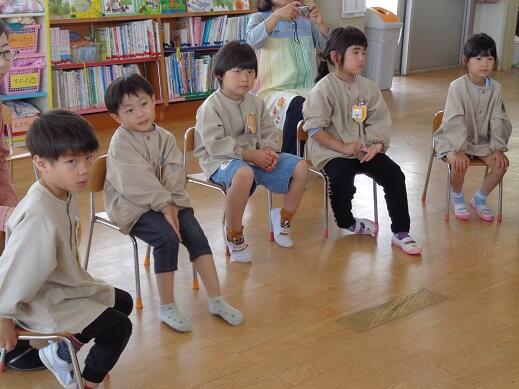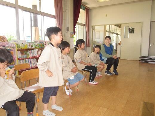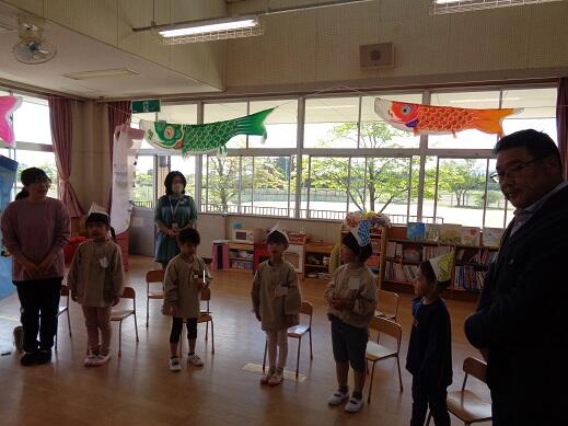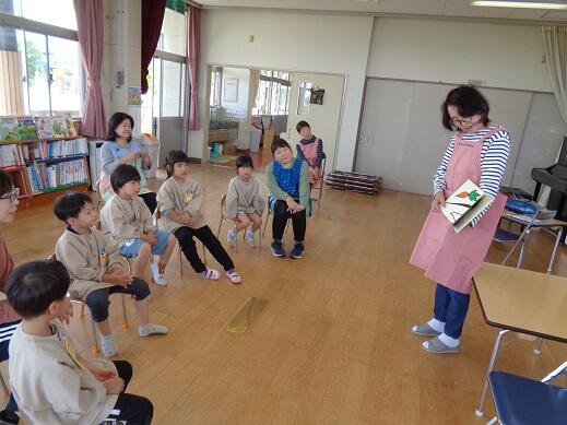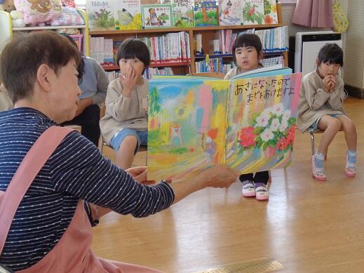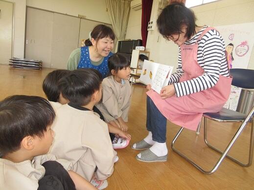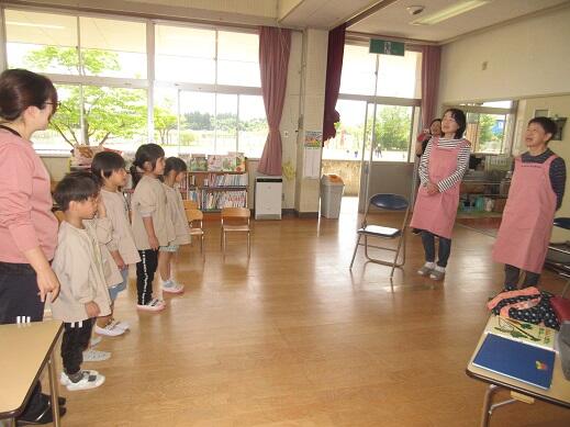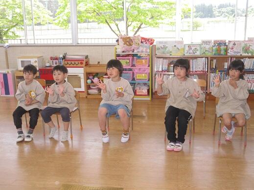 5月15日(水)あづま子どもの本の会より濱田裕子さんと篠原和子さんに来ていただき、今年度初めての「5月の読み聞かせ」を全員で行いました。手遊び「はじまるよったら はじまるよ」から始まり、絵本「あさになったので まどをあけますよ」、絵本「どっち」「にんじんとだいこんとごぼう」「おひさま わらった」を読んでいただきました。みんな、絵本の世界にはいり、楽しく聞くことができました。お礼に、「こにのぼり」を聞いていただきました。楽しい読み聞かせをありがとうございました。