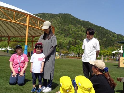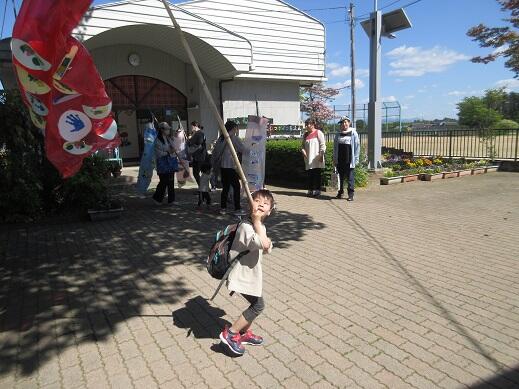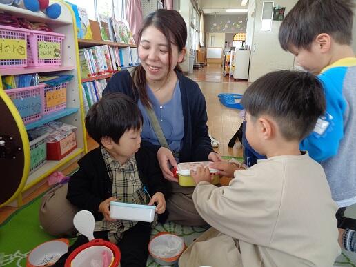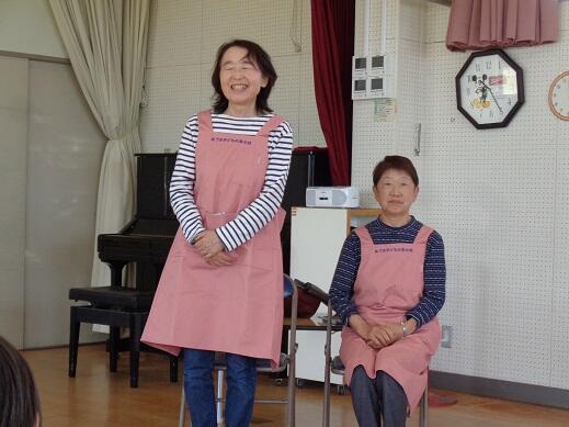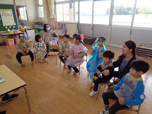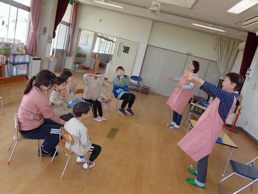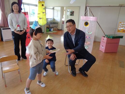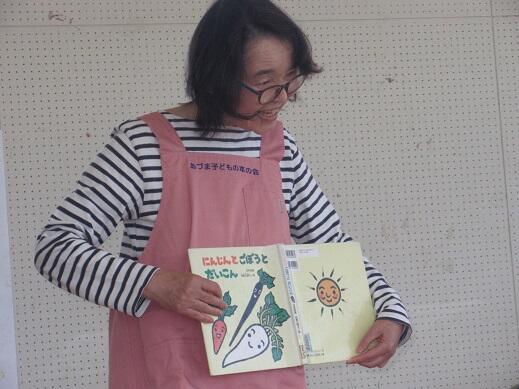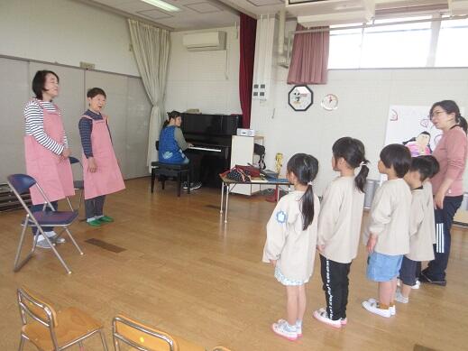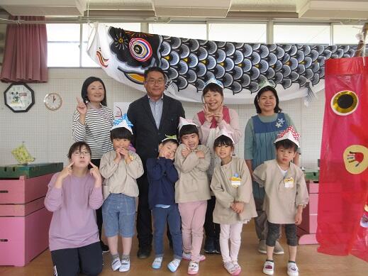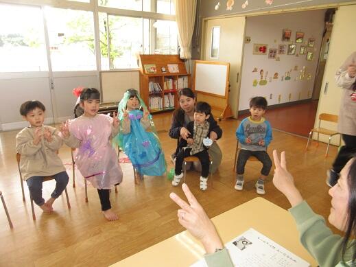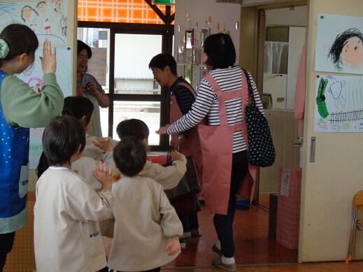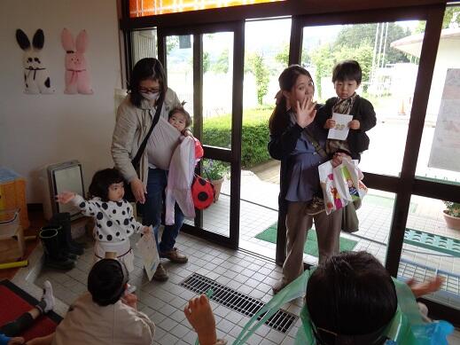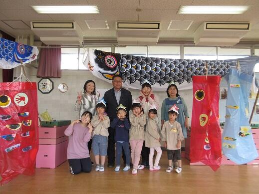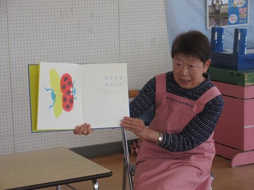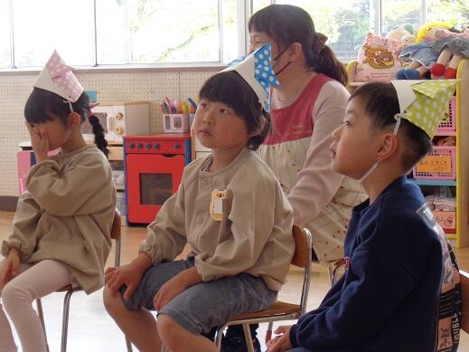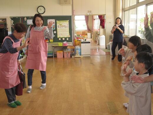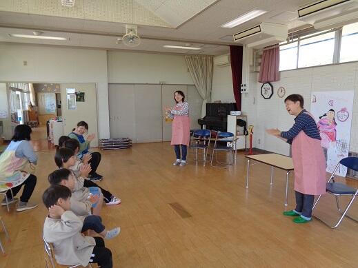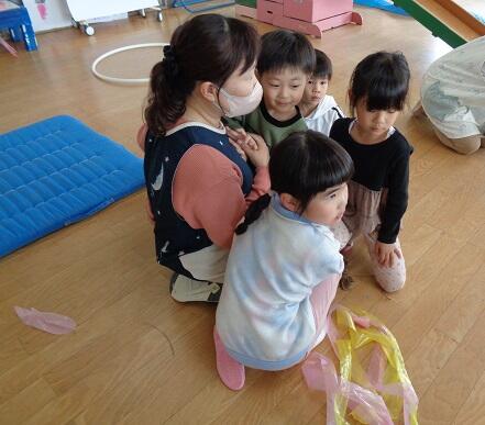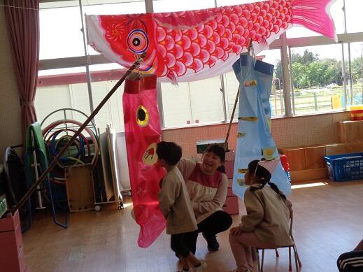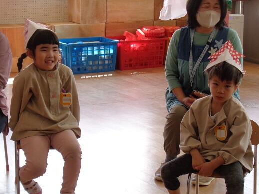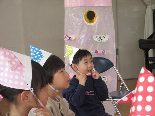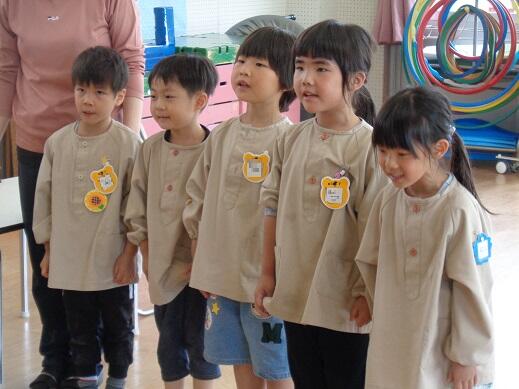 5月15日(水)あづま子どもの本の会より濱田裕子さんと篠原和子さんに来ていただき、今年度初めての「5月の読み聞かせ」を全員で行いました。手遊び「はじまるよったら はじまるよ」から始まり、絵本「あさになったので まどをあけますよ」、絵本「どっち」「にんじんとだいこんとごぼう」「おひさま わらった」を読んでいただきました。みんな、絵本の世界にはいり、楽しく聞くことができました。お礼に、「こにのぼり」を聞いていただきました。楽しい読み聞かせをありがとうございました。