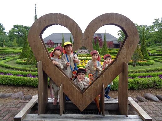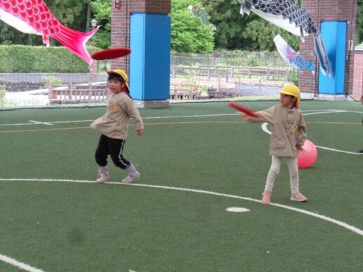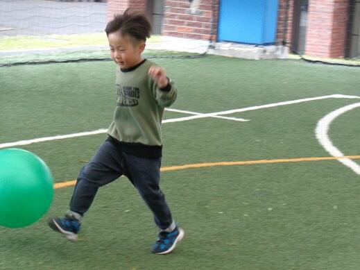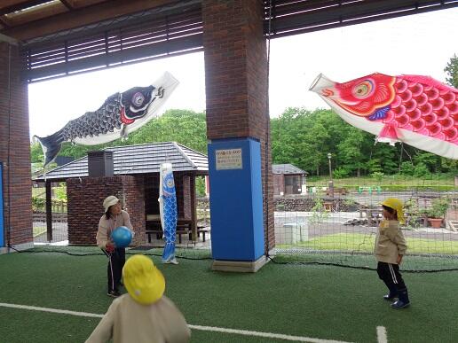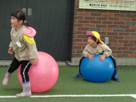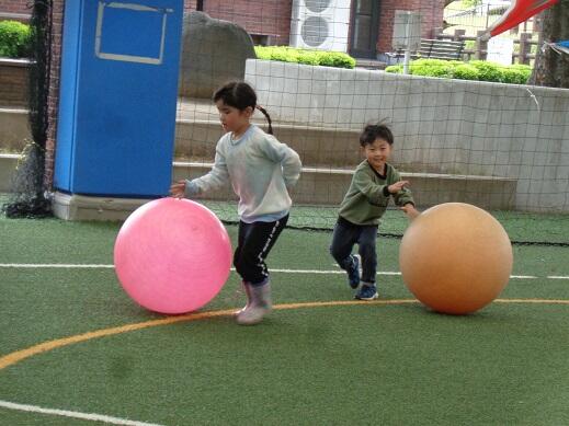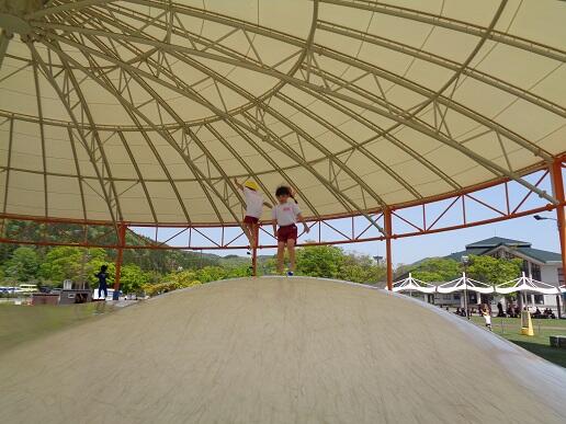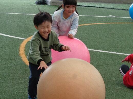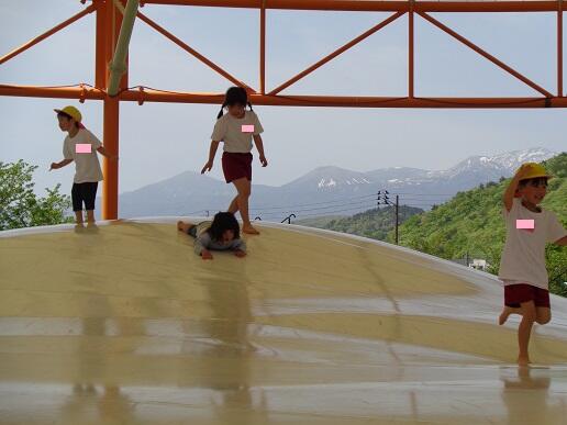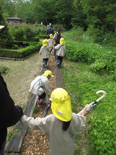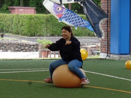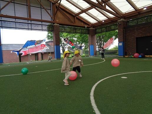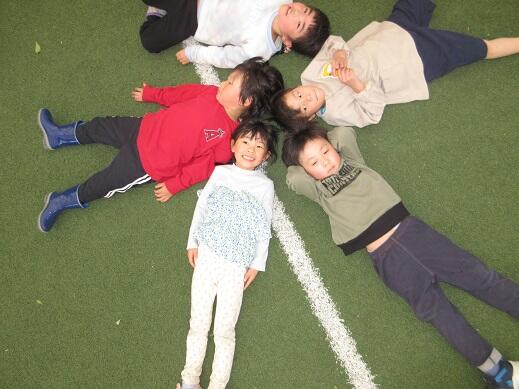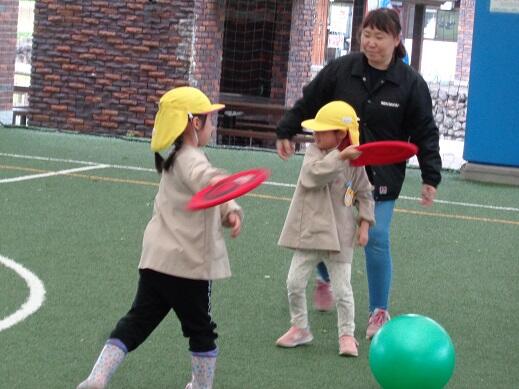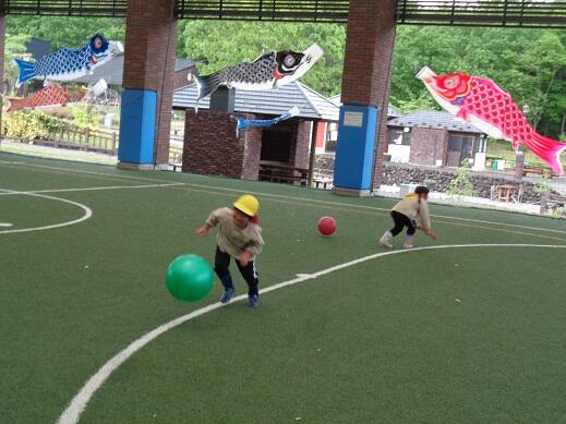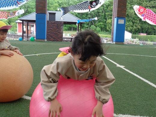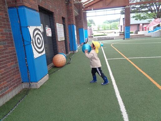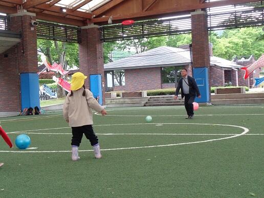 5月7日(火) 今日は園外保育で四季の里に行ってきました。連休明けで小雨まじりの天候だったためか、朝から来ているお客さんは、誰もいませんでした。早速、屋根付き運動場(木洩れ日広場)で、思いきり体を動かしました。人工芝で寝転んでも汚れません。バランスボールのようなビニールボールが大小15こほどあり、好きなボールを転がしたり、投げたりして遊びました。また、ソフトフリスビーもあって、フリスビー投げに挑戦していました。