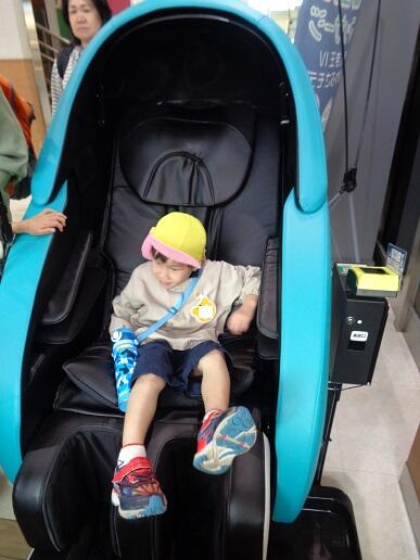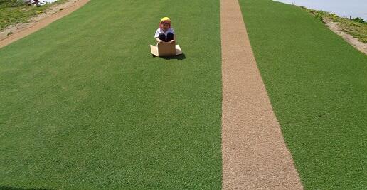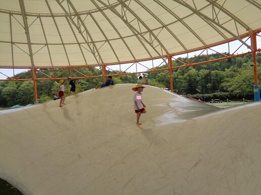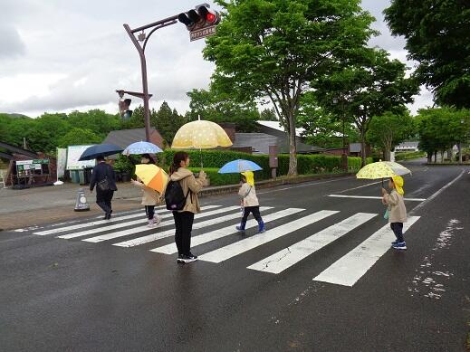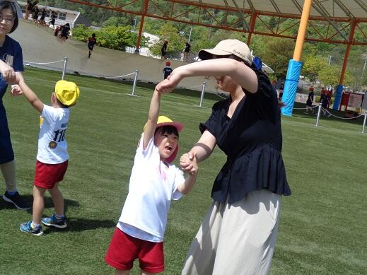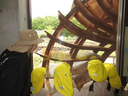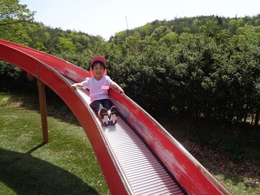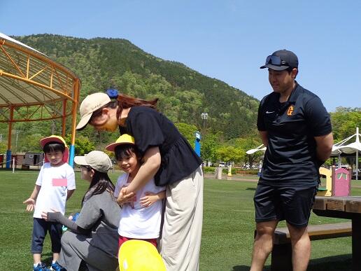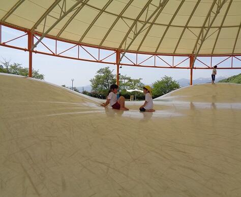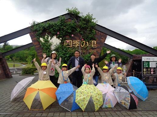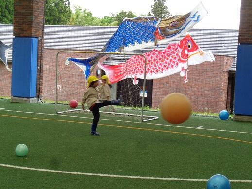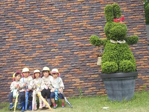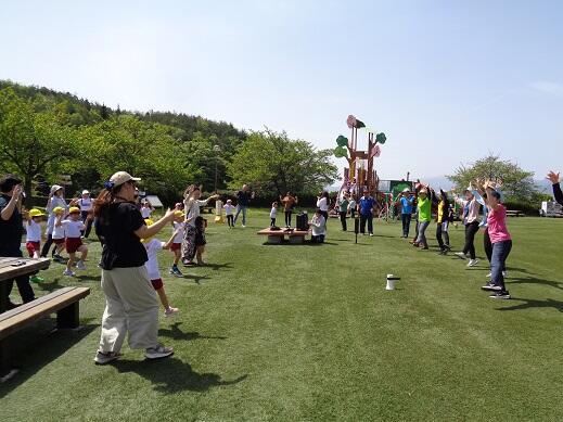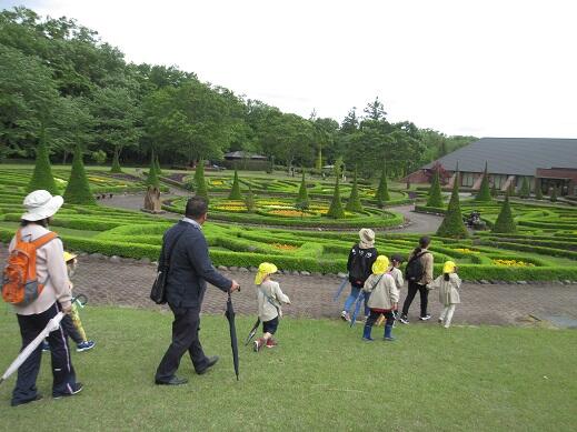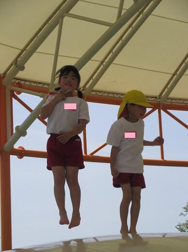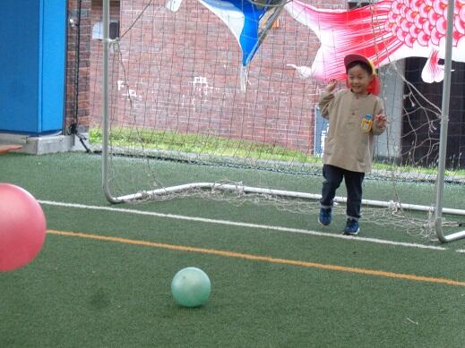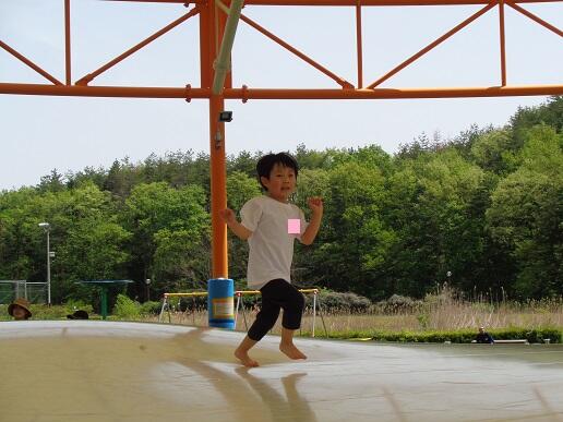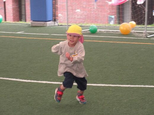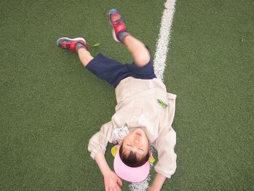 5月7日(火) 今日は園外保育で四季の里に行ってきました。連休明けで小雨まじりの天候だったためか、朝から来ているお客さんは、誰もいませんでした。早速、屋根付き運動場(木洩れ日広場)で、思いきり体を動かしました。人工芝で寝転んでも汚れません。バランスボールのようなビニールボールが大小15こほどあり、好きなボールを転がしたり、投げたりして遊びました。また、ソフトフリスビーもあって、フリスビー投げに挑戦していました。