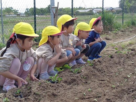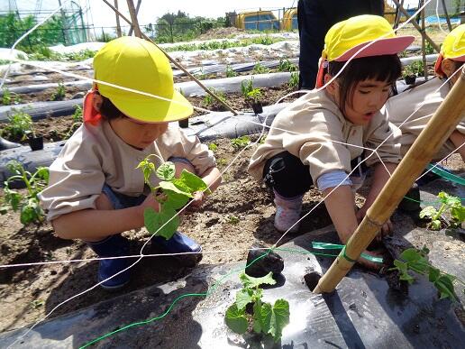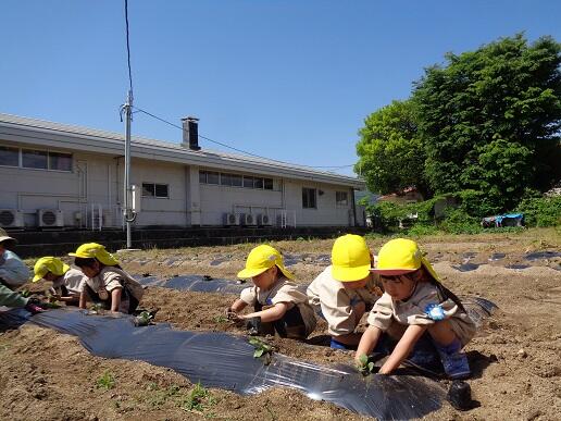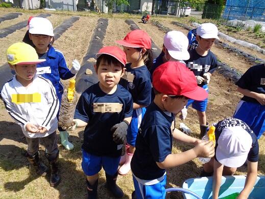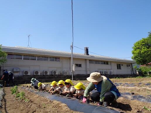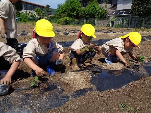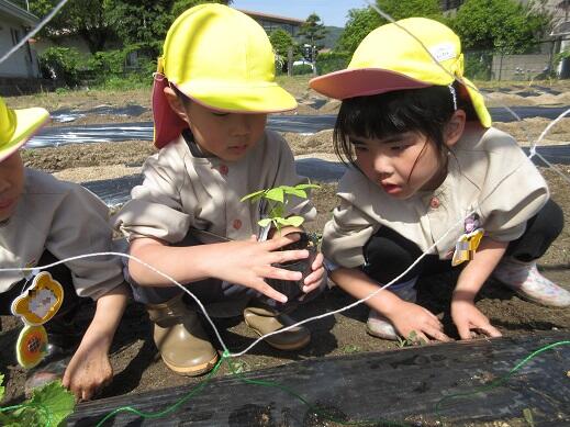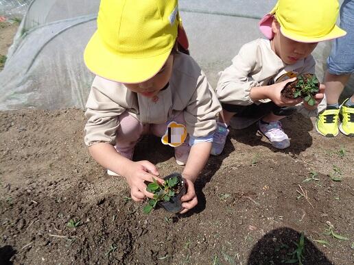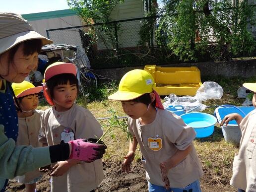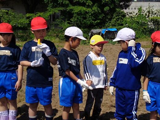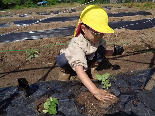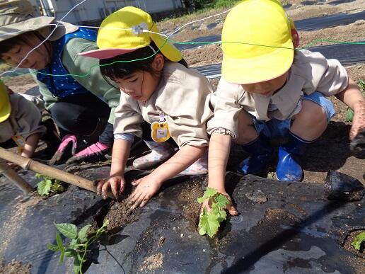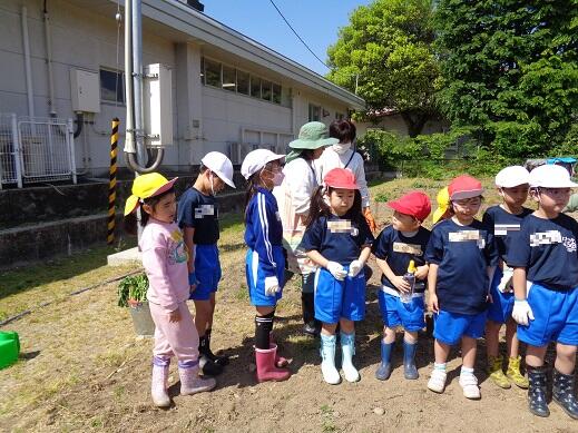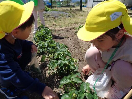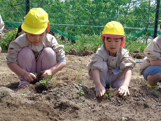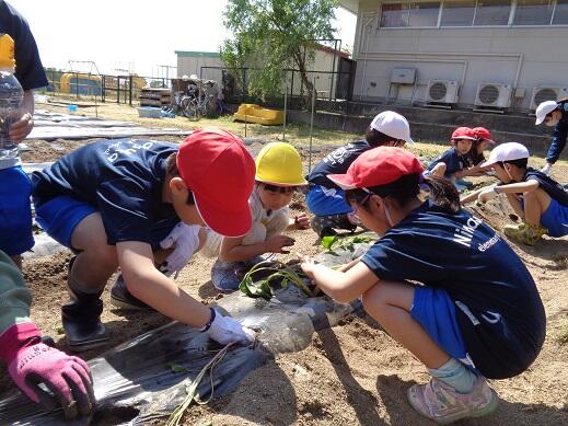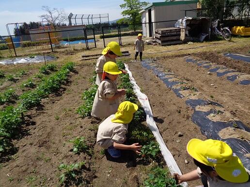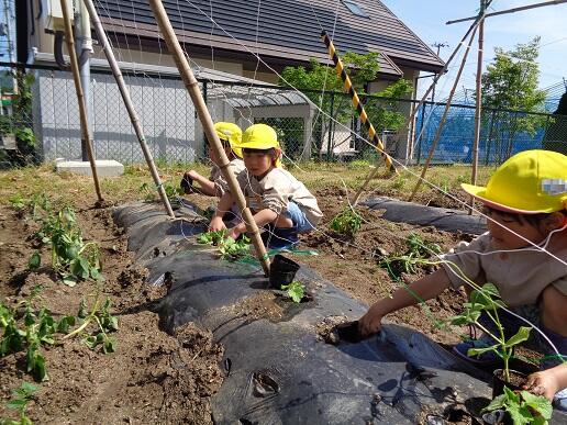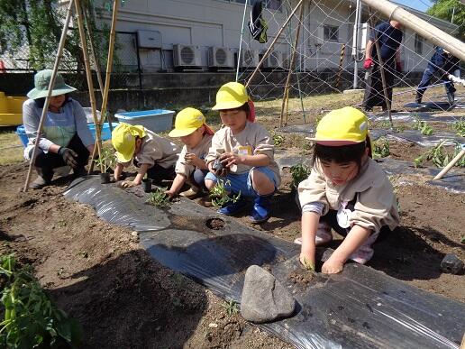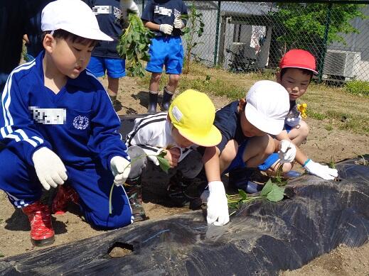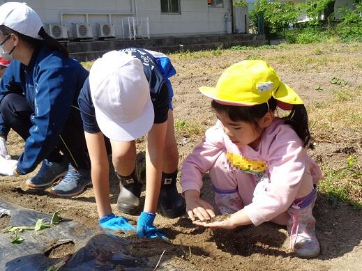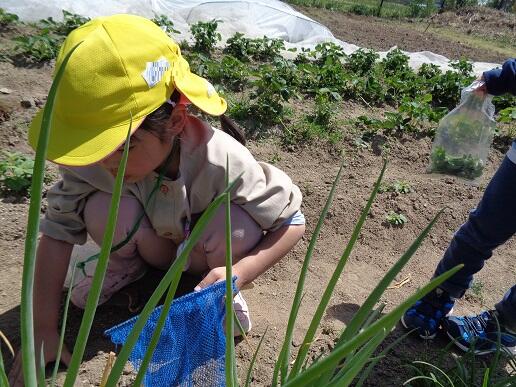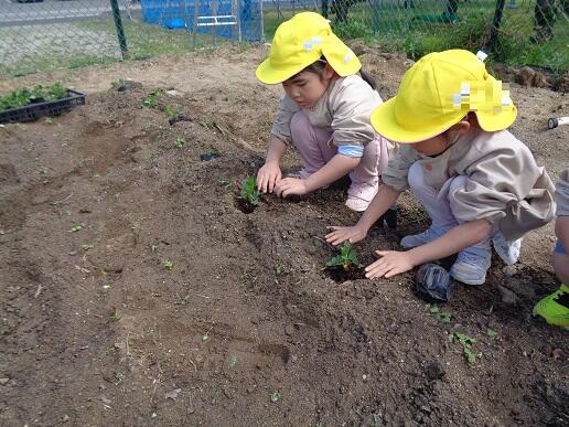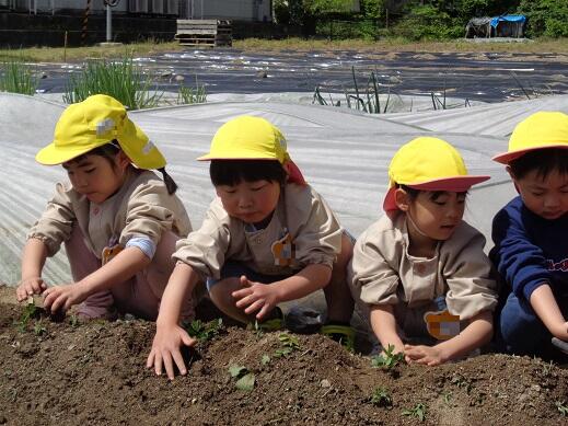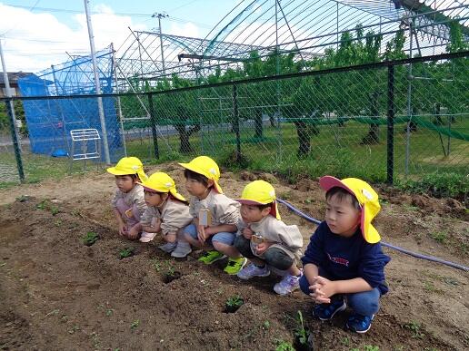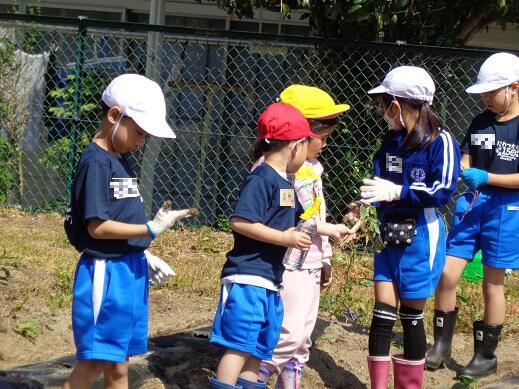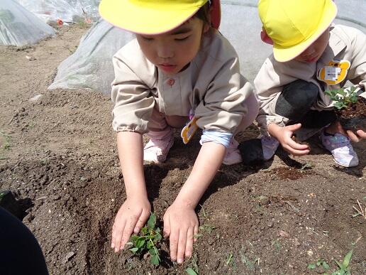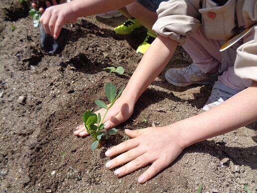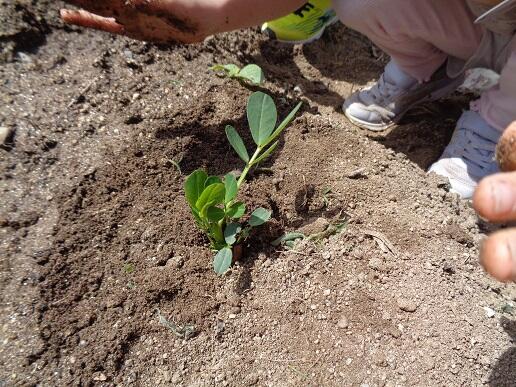 5月2日(木)落花生の苗を植え付けました。今年できた初めての苗なので、苗植えが初体験の子もいました。昨年経験していた子たちは、素早くスムーズに植え付けることができました。秋には美味しい落花生ができると良いですね。その後畑で虫探しをしました。ちょうちょやテントウムシを見つけて捕まえていました。本でエサを探している子もいて、なかなか研究熱心でした。
