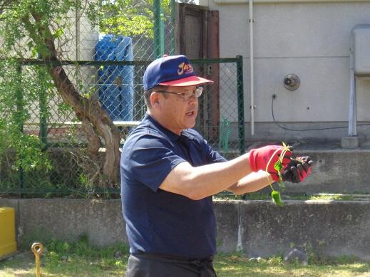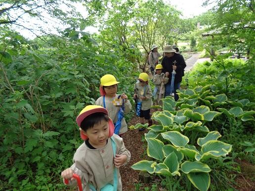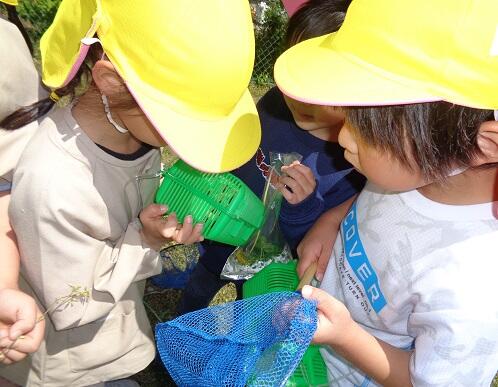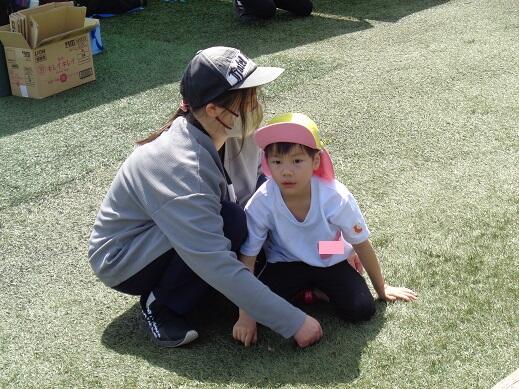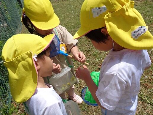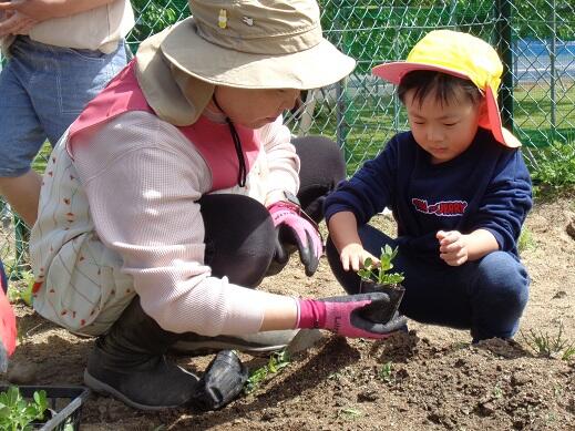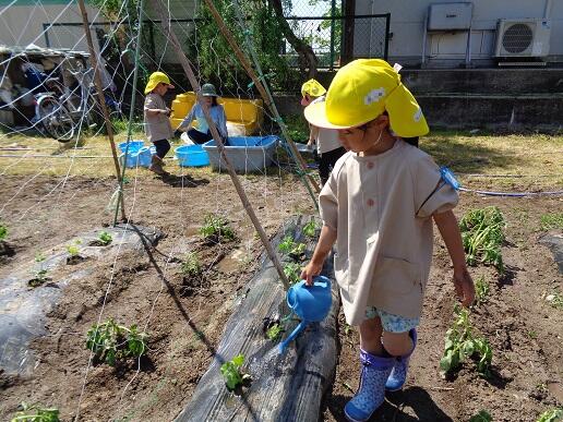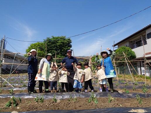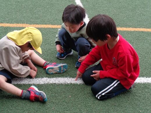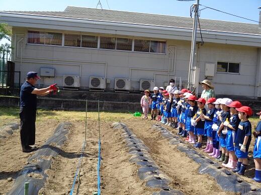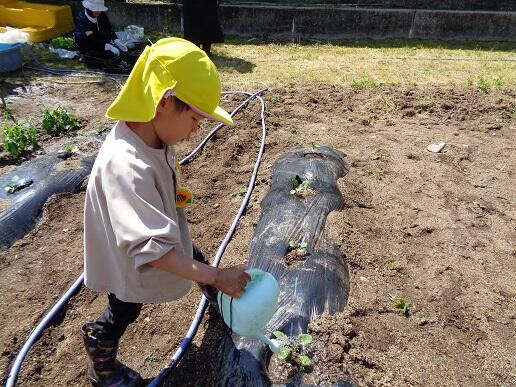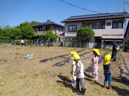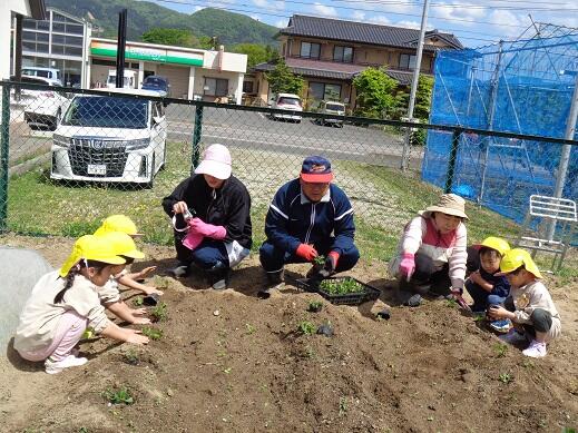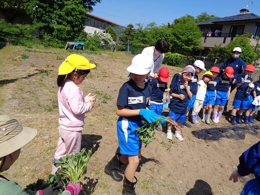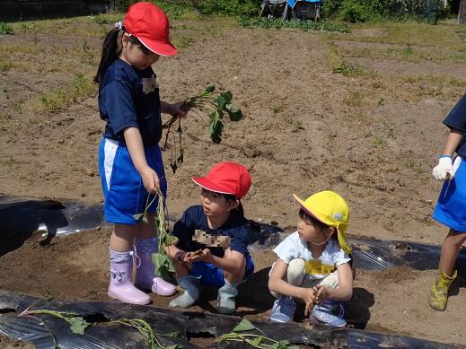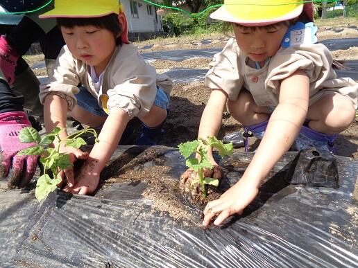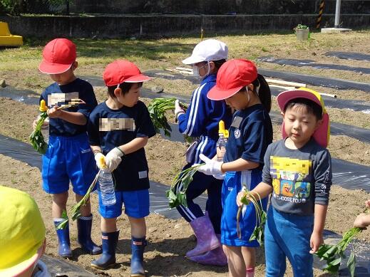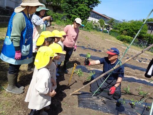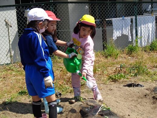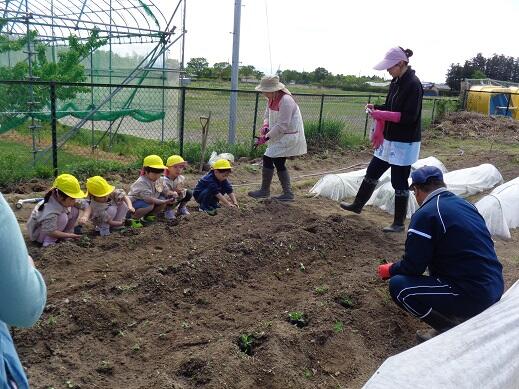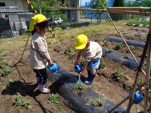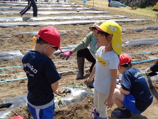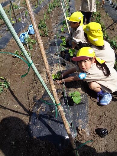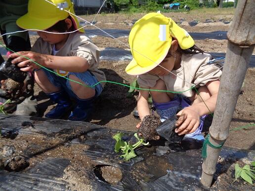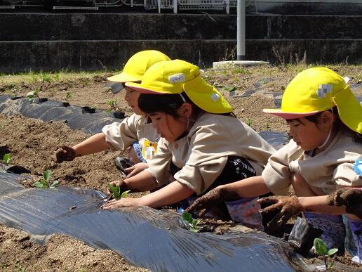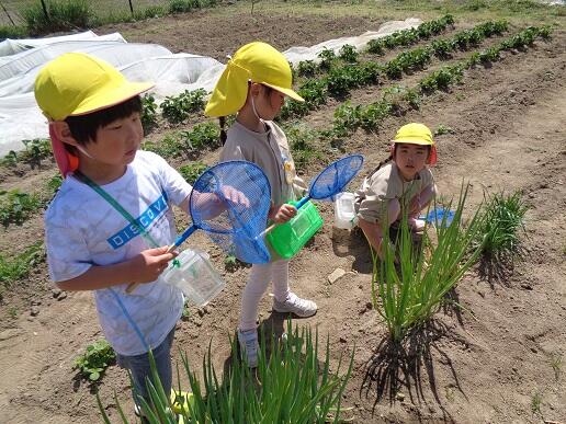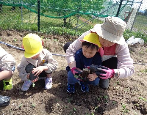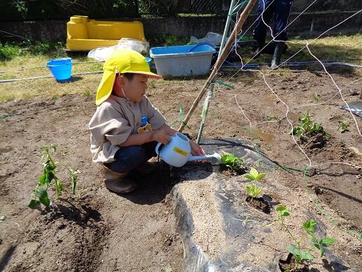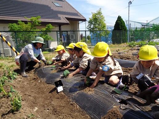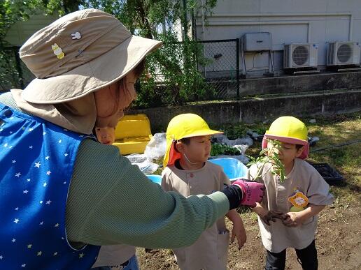 5月2日(木)落花生の苗を植え付けました。今年できた初めての苗なので、苗植えが初体験の子もいました。昨年経験していた子たちは、素早くスムーズに植え付けることができました。秋には美味しい落花生ができると良いですね。その後畑で虫探しをしました。ちょうちょやテントウムシを見つけて捕まえていました。本でエサを探している子もいて、なかなか研究熱心でした。