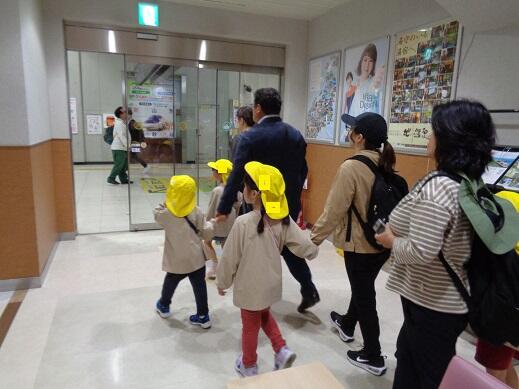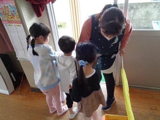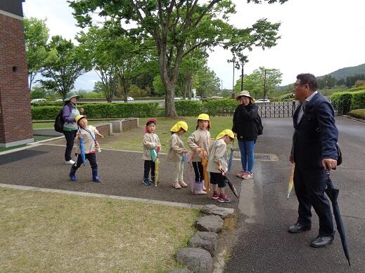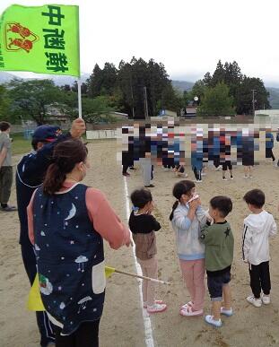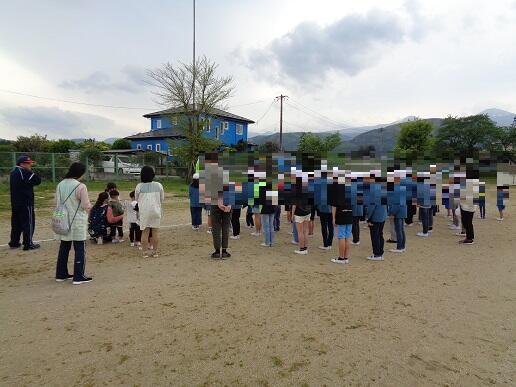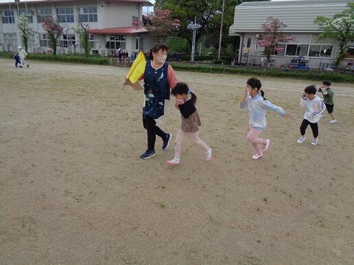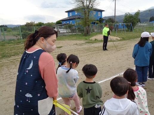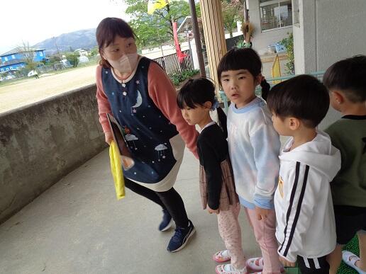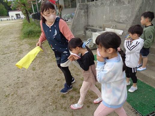 5月1日(水) 幼小合同の避難訓練をしました。「地震の後に火災が発生した。」との想定で行いました。初めての避難訓練の子も、ハンカチで口を押さえ、素早く避難することができました。小学生と同じスピードで校庭南側に整列し、先生方の話を聞くことができていました。