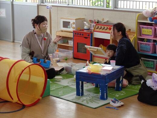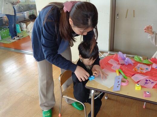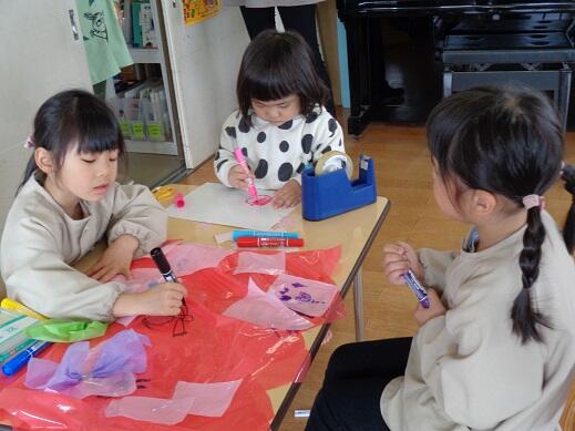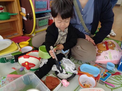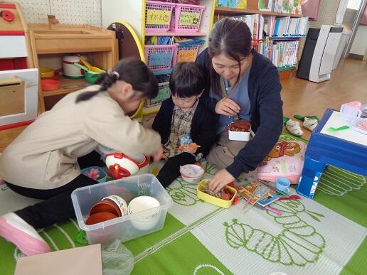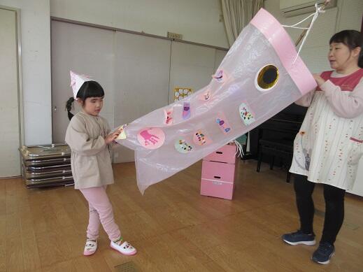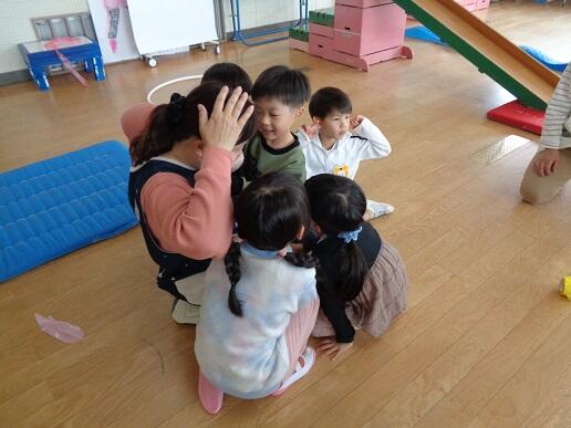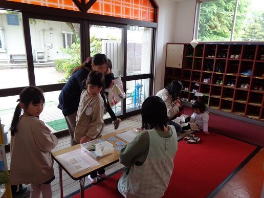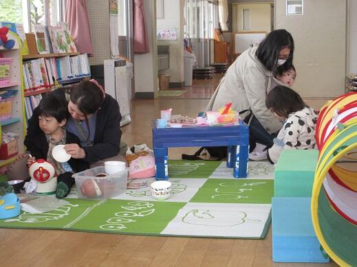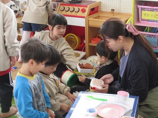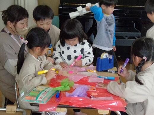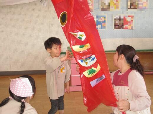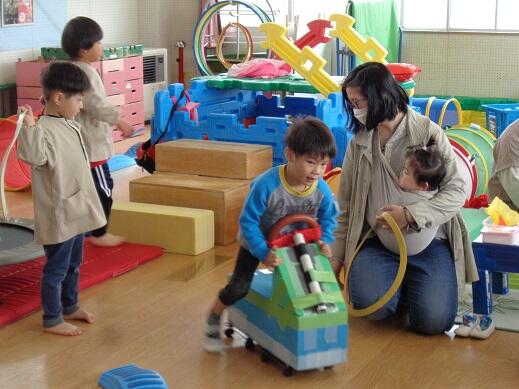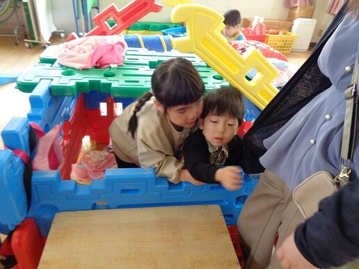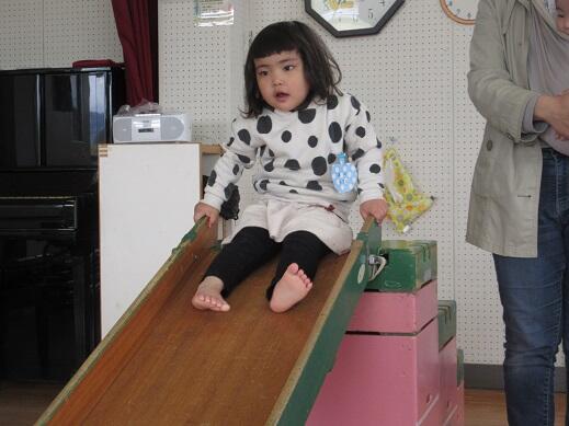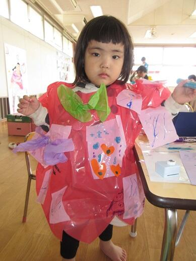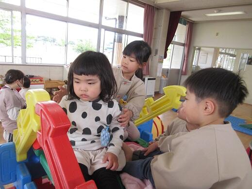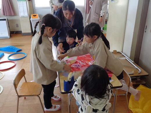 5月9日(木) 5月の2・3歳児交流保育を行いました。寒い日で、保育室の中で好きな遊びをしました。ままごとセットや滑り台で遊んでいました。女の子たちは、小さい子の衣装をつくるといって、赤いビニールでドレスを作りました。完成して着させてあげました。最後に、紙芝居を読んで終了となりました。また、遊びに来てください。次は、いちご狩りができると思います。