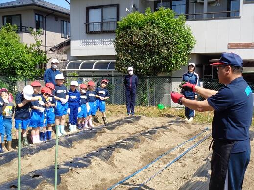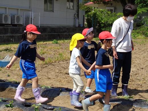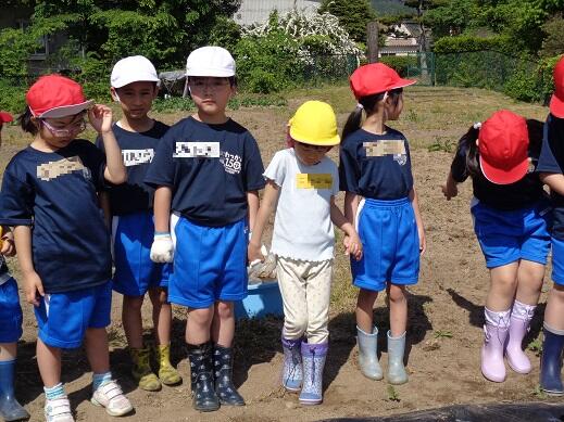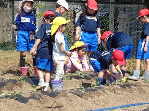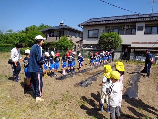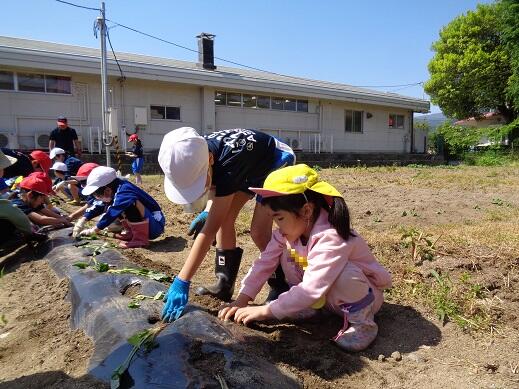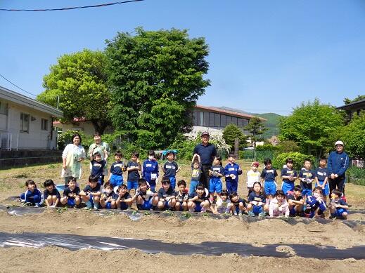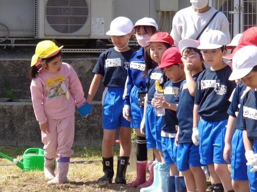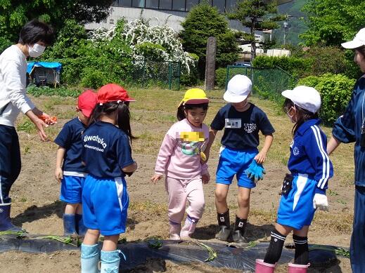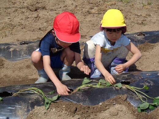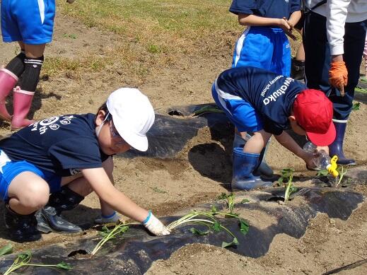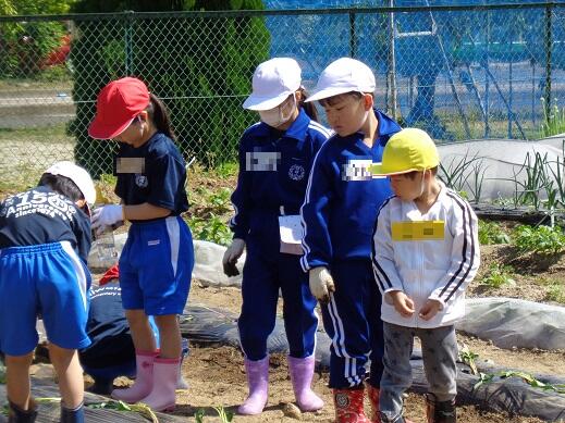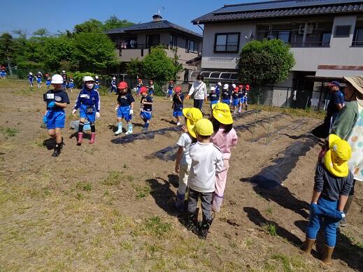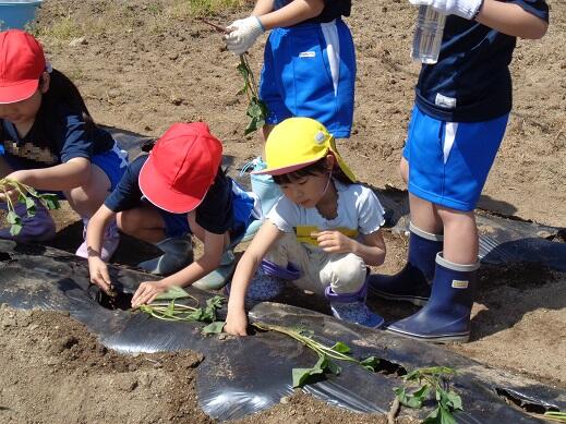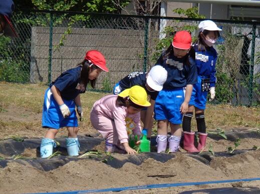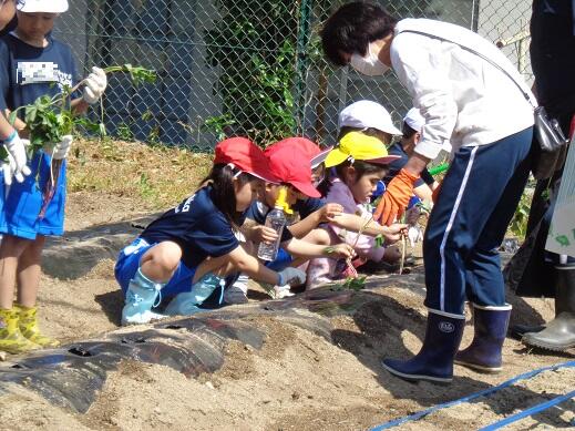 5月10日(金) 庭塚幼稚園と庭塚小1・2年生合同によるサツマイモ(紅はるか)の苗植えを行いました。グループを作り、各グループに幼稚園生が入って、1・2年生に手伝ってもらいながらサツマイモの苗を植えました。数年来、この行事は続いており、子ども達もこの時期の恒例行事となっています。合わせて100本の苗を植え、10月下旬には、おいしいサツマイモが収穫できると思います。