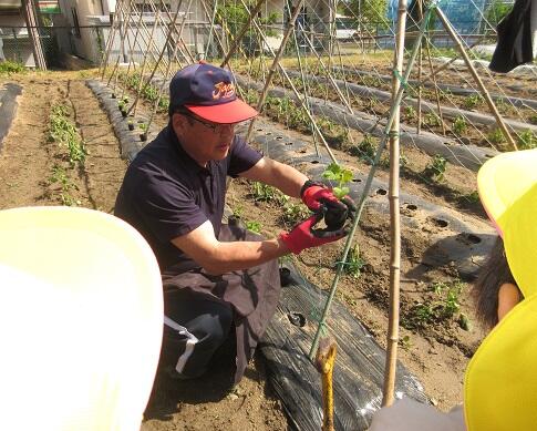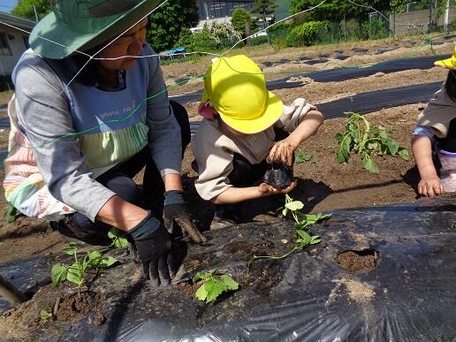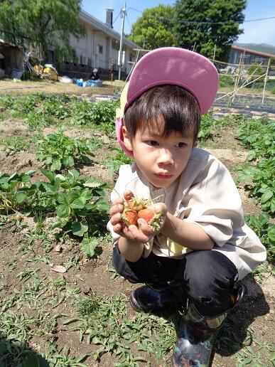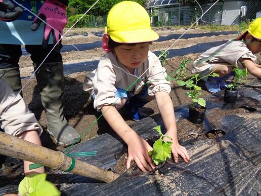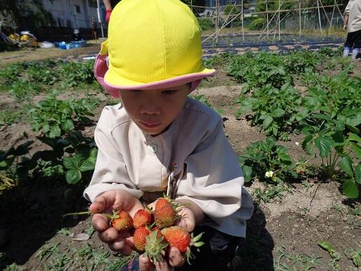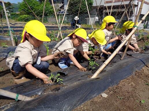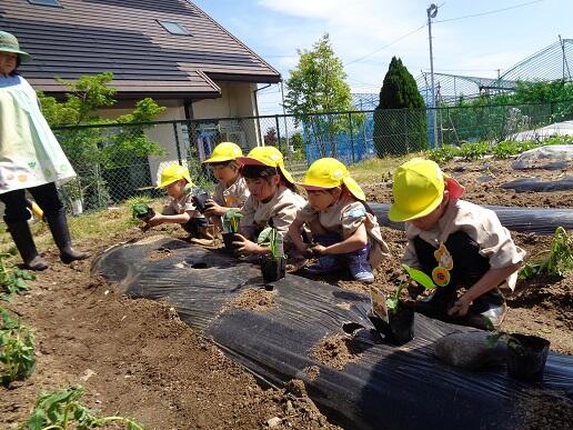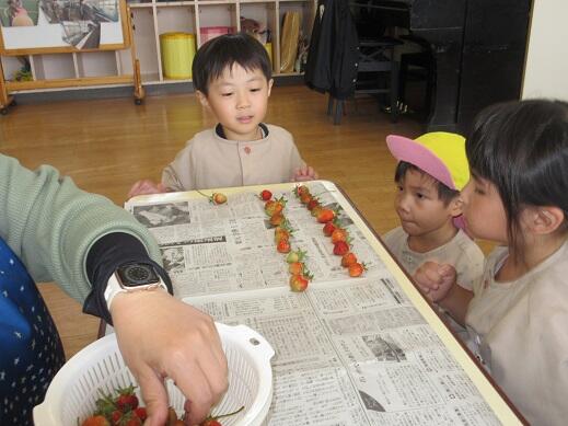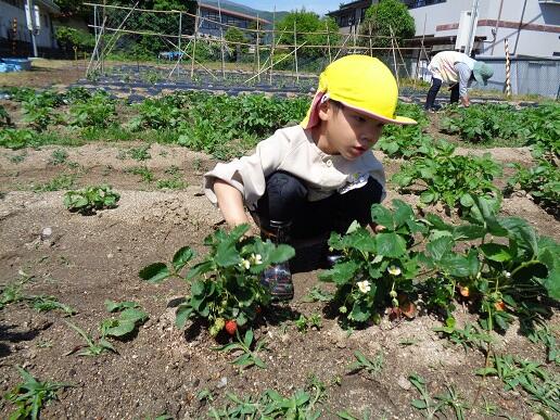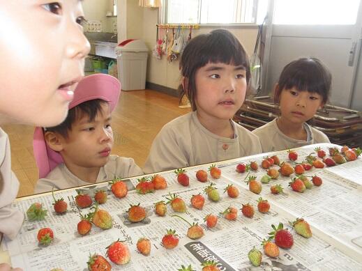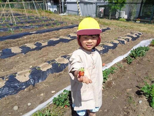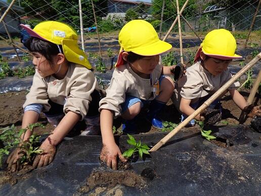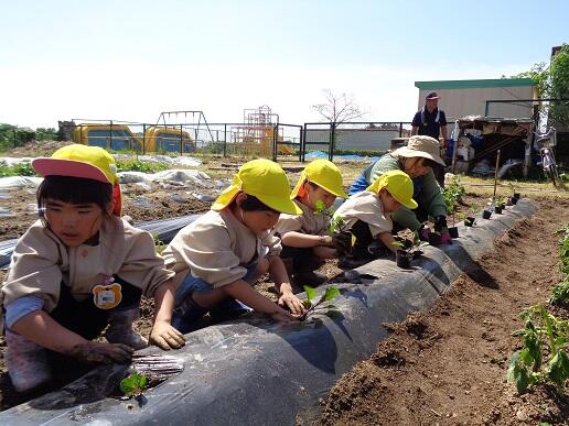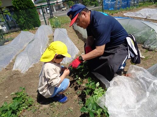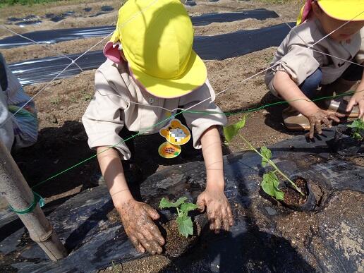 5月15日(水) 朝から子ども達と畑に行き、ナス、キュウリ、インゲン、トマトの苗を植えました。全部で200近くの苗を子どもたちが植えました。一度教えると、話をよく聞き、丁寧に作業ができる子ども達です。たくさんの苗を短時間で上手に植えられたのには、びっくりしました。これから毎日育つのが楽しみですね。朝、畑に来て水やりをがんばってほしいです。その後、イチゴの収穫をしました。今日はイチゴが64個収穫できました。みんなで数えてみました。