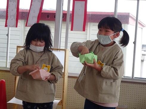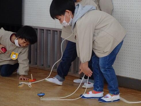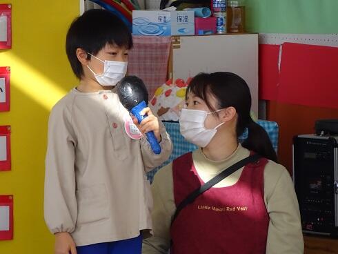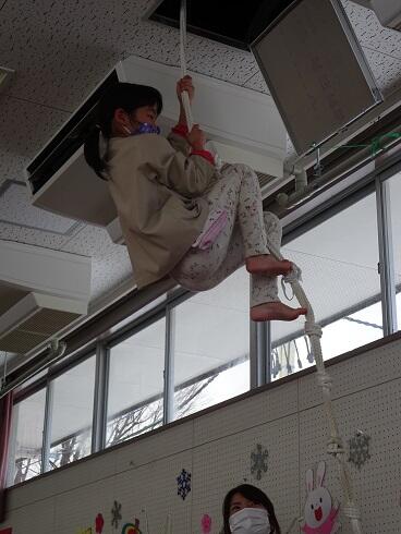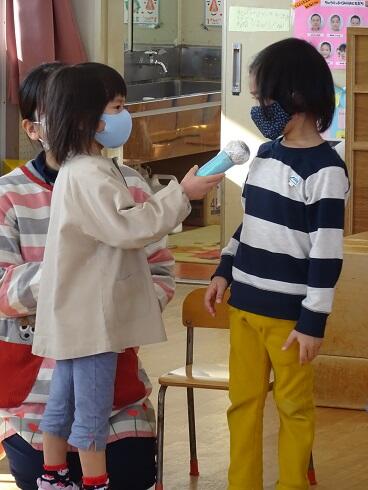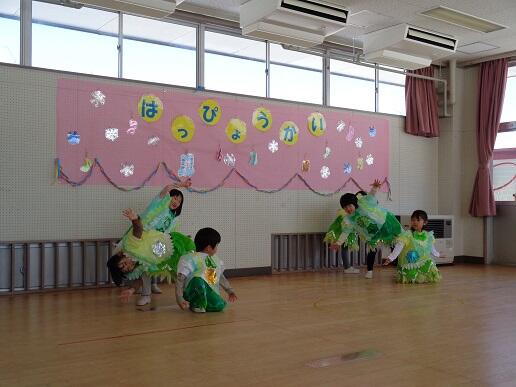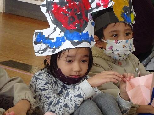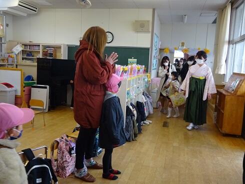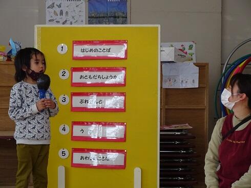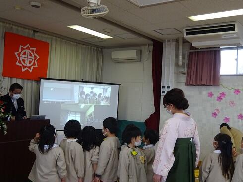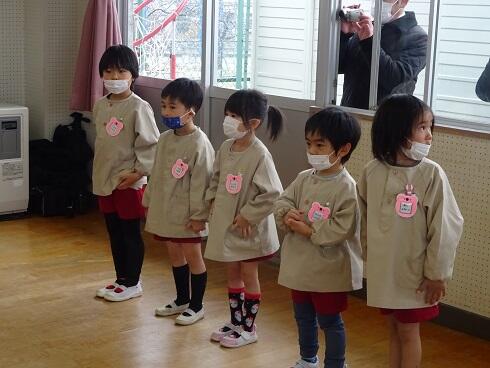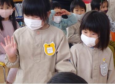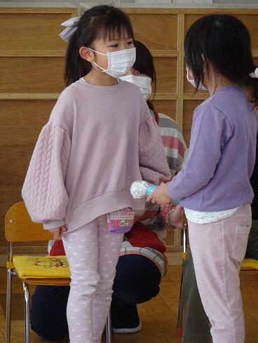 初めに、年少さんと第3学期の終業式を行いました。仲良く遊ぶことができるようになったことや縄跳びが上手になったこと等をたくさんほめてもらいました。