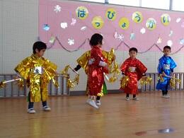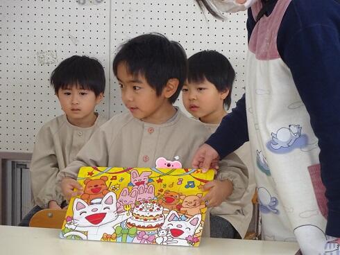 次に、修了証書授与式を行いました。さすが、年長児。大きな声で返事をし、しっかりした態度で証書を受け取ることができました。小学校へ行っても何事にもチャレンジし、元気に生活してほしいです。