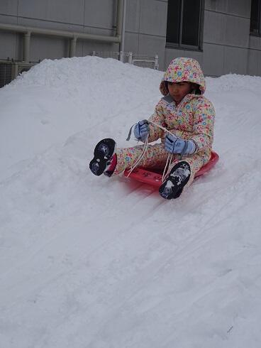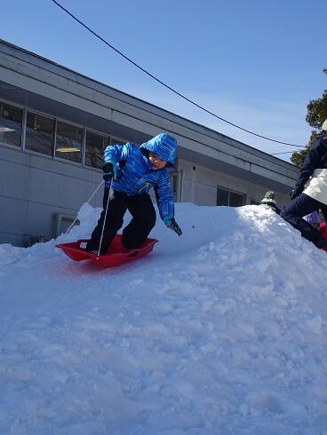 1月26日(水) 今日は天気に恵まれ、そり滑りには絶好の日となりました。子どもたちの間では、難しいそりの立ち乗りが始まりました。そりの上に立って乗るのはとても難しくすぐに転んでしまいますが、何度も挑戦していました。十数回で雪の滑り台の下まで立って乗れた子がでてくると、友達に負けていられないと何度も挑戦していました。