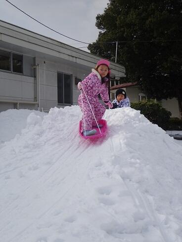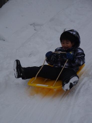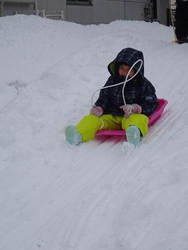1月20日(木) 例年より雪が多く、庭塚幼稚園の裏の畑にはそり遊びのできる、大きなすべり台ができています。幼稚園のみんなは、自宅からそりを持ってきて、そり遊びを楽しんでいます。大人の背丈より高いところから滑るのは、年少組にとって冒険です。これからどんどん滑り方も上手になると思います。