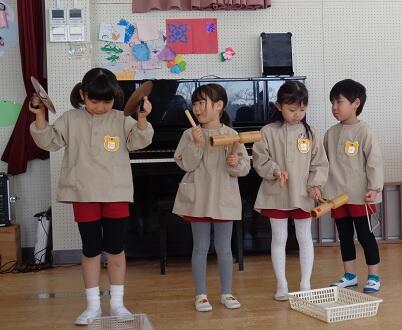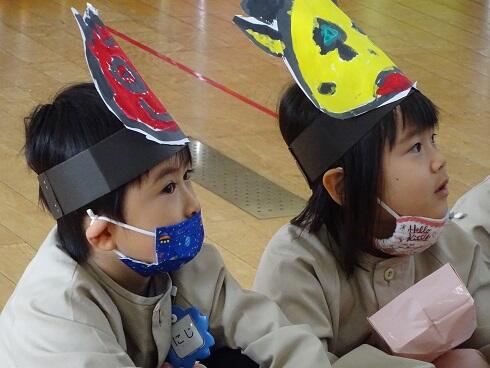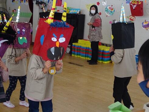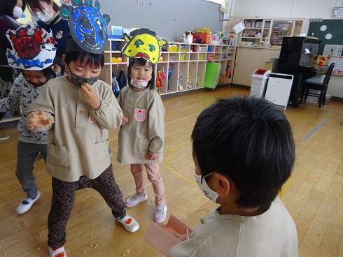 2月3日(木)各クラスごとに、豆まき集会を行いました。子供たちは、「泣き虫鬼」や「ゲーム鬼」を追い出したいと決め、マスクをしながらも「福は内、鬼は外」と元気よく声を出して、豆をまきました。個性豊かなかわいい鬼の面をみんなで作り、鬼役を交代しながら行いました。