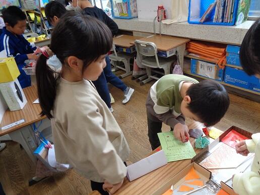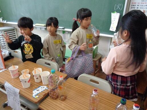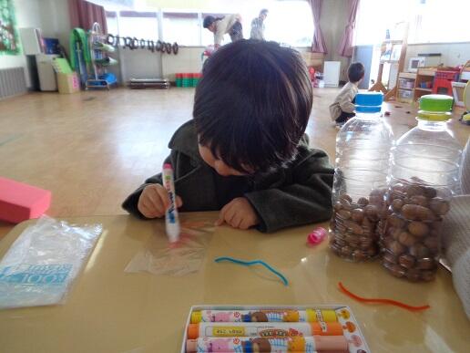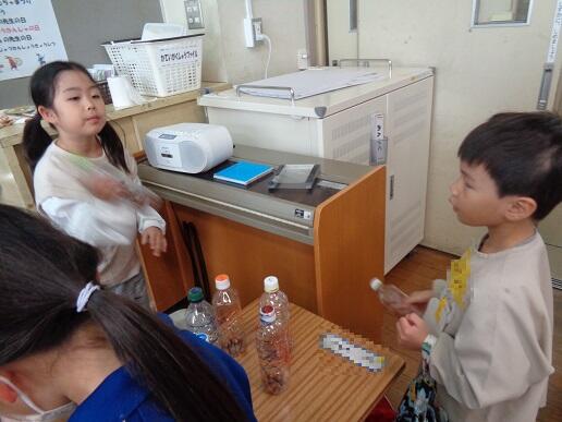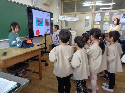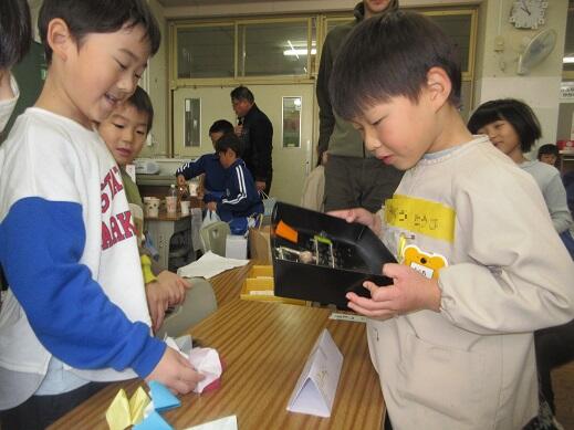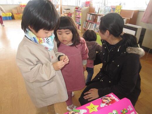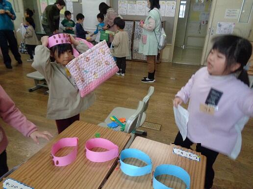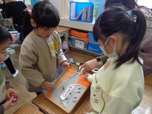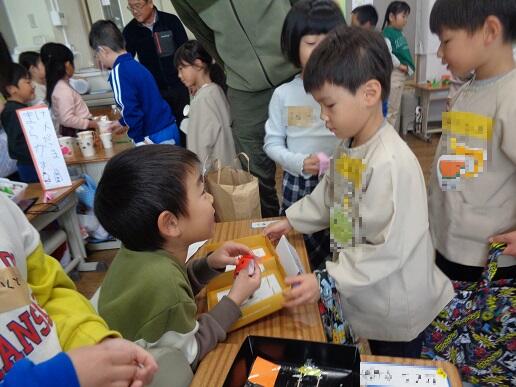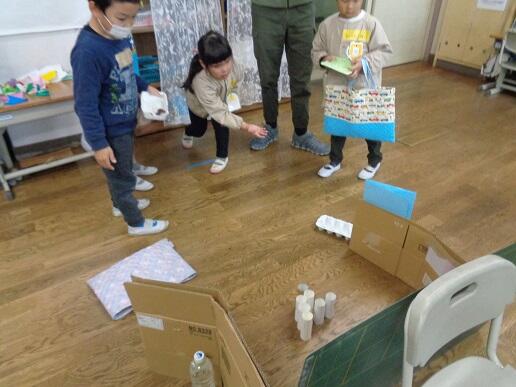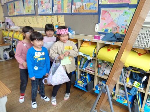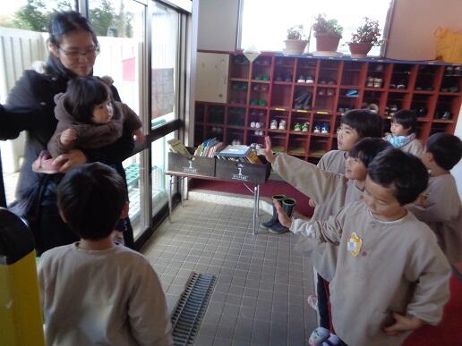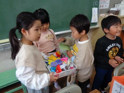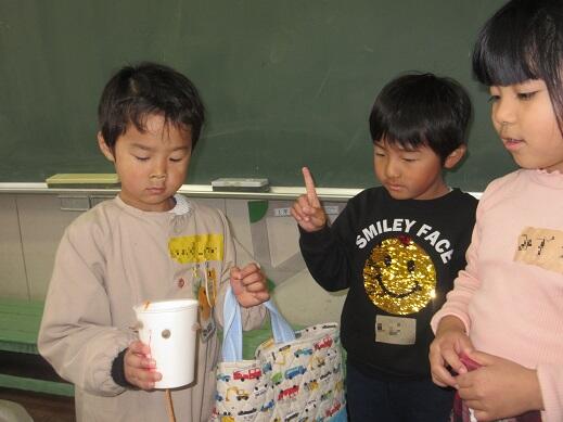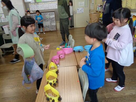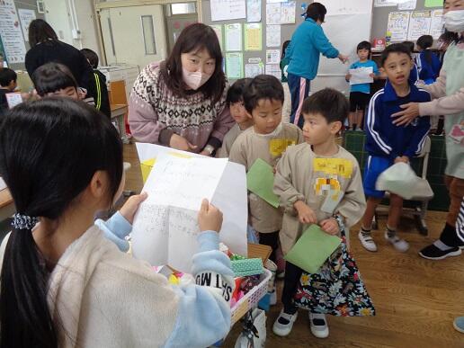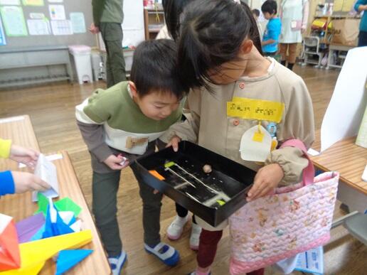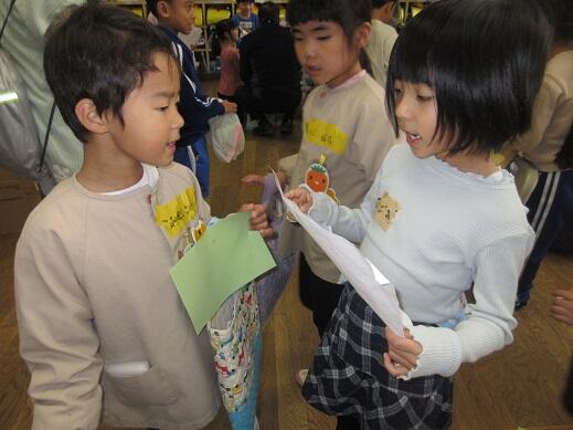 11月18日(火) 庭塚小1年生教室のおもちゃ祭りに招待され、参加してきました。ボーリング屋、的入れ屋、かんむり屋、ドングリ転がし屋、けん玉屋、マラカス屋などがありました。1年生は遊びの方法を説明をし、遊んだ後も景品を選ばせるようにしていました。幼稚園生にとっては、この体験が、自分たちでもやってみたいと思い、再現遊びなどをするようになると考えられます。良い体験の機会となりました。