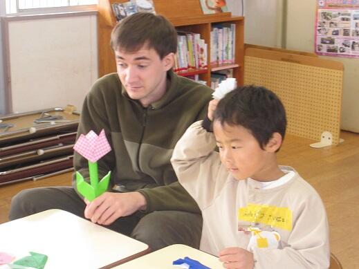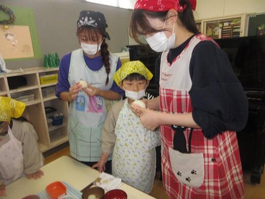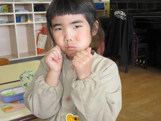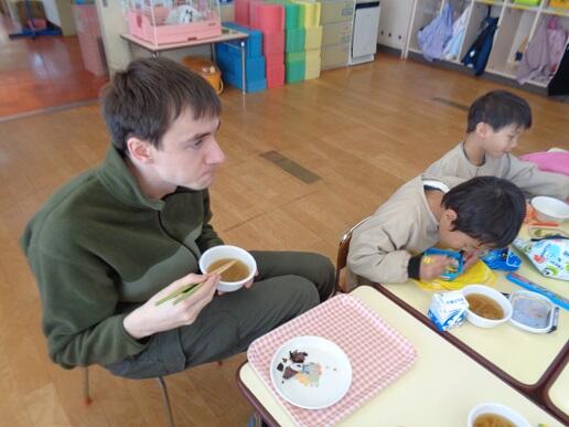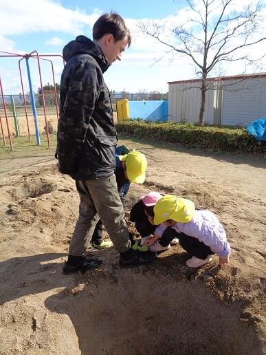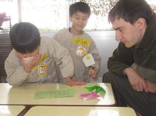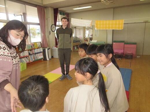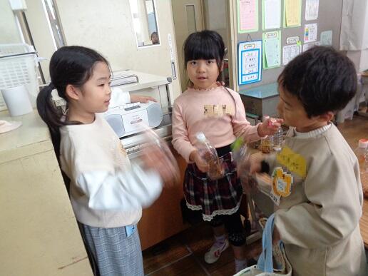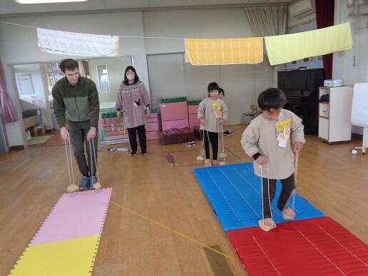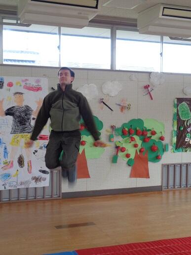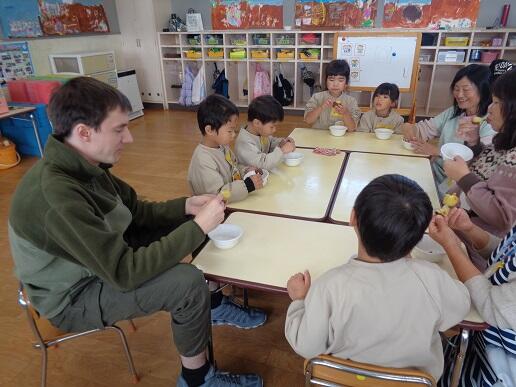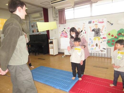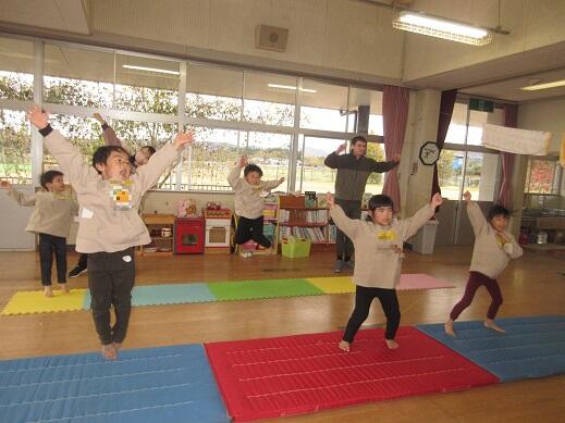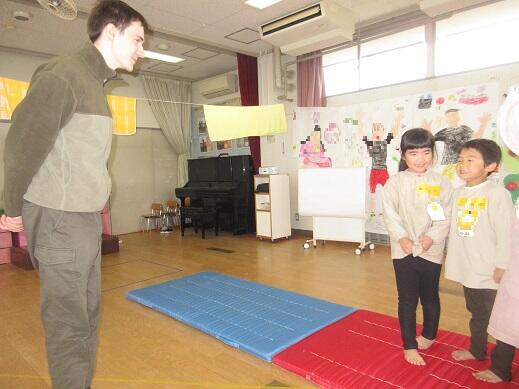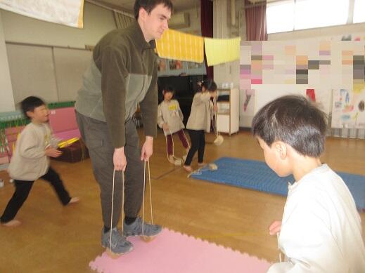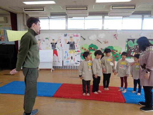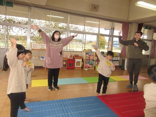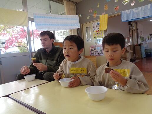 11月19日(火) ALTのディビット先生が幼稚園に来てくれました。子どもたちは、自分の名前を「マイネームイズ〇〇」と英語で言いました。あいさつは、もう、言われなくいてもできています。次に、ドングリマン体操をし、ぽっくりと縄跳びをしました。その後、1年生のおもちゃ祭りに参加し、戻ってから、おやつに「焼き芋」を食べました。外遊びでは、かくれんぼを一緒に行い、みんなで楽しみました。