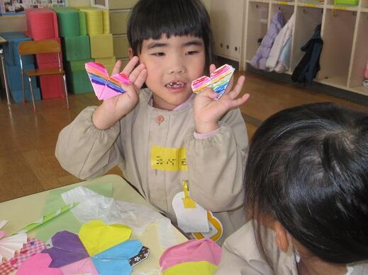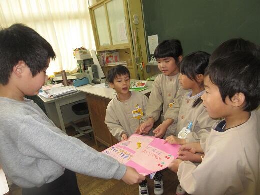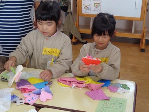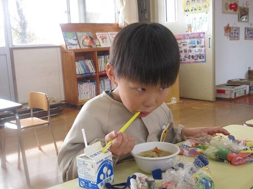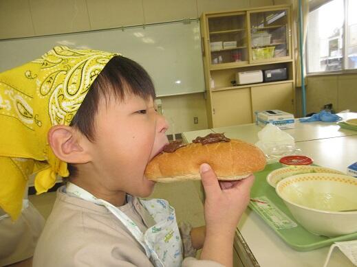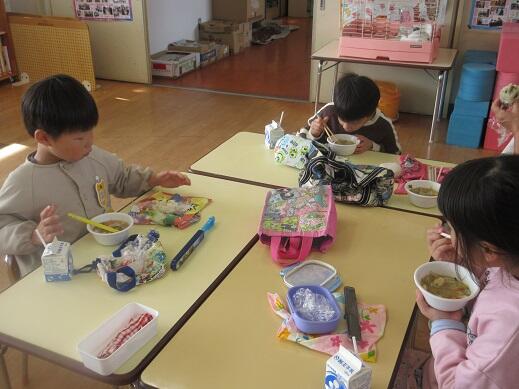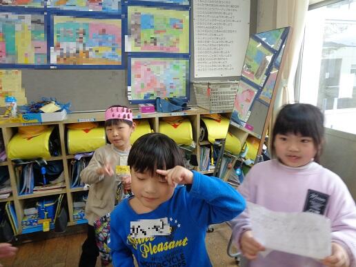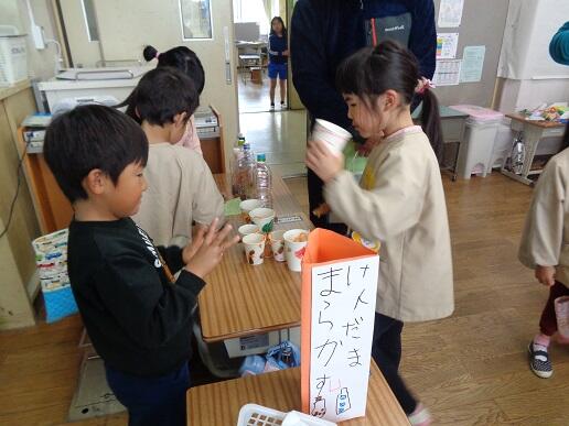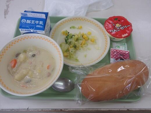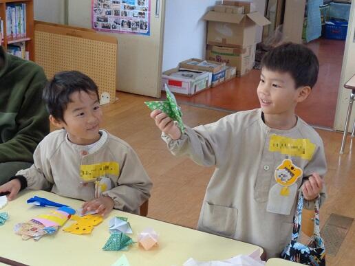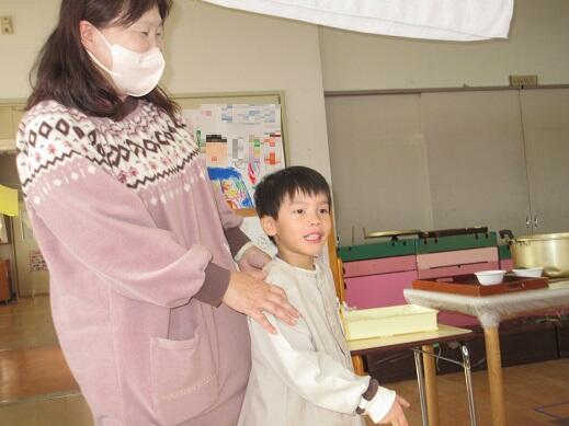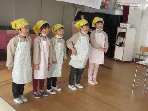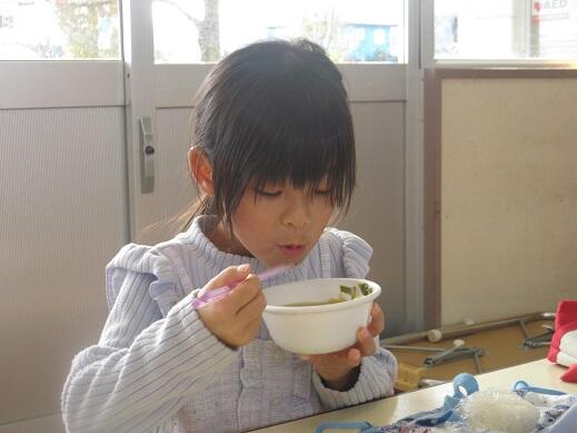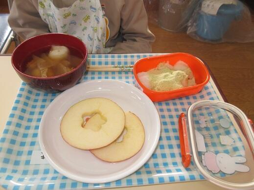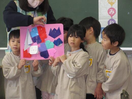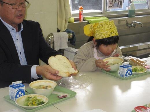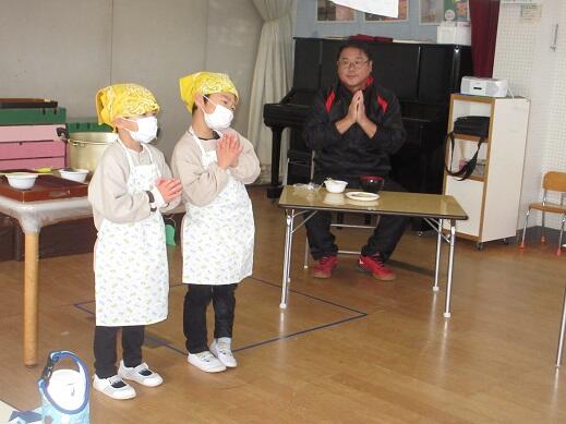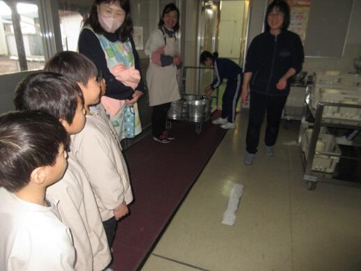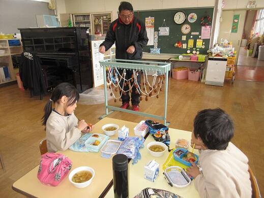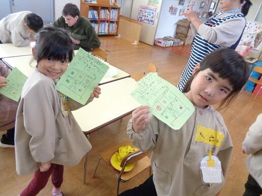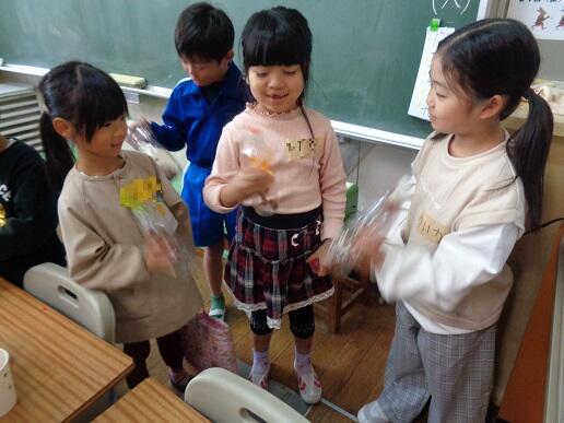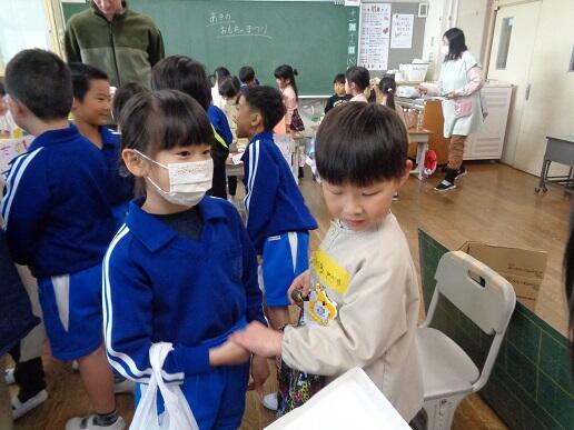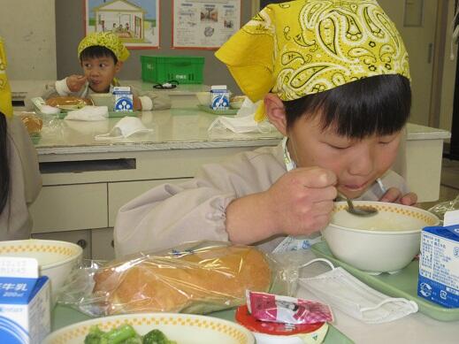 12月3日(火)今日の給食試食会の献立は、「米粉パン、豆乳シチュー、キャベツとコーンのサラダ、牛乳、りんごゼリー」です。子ども達も楽しみにして小学校へ出かけました。最初に、おもちゃ祭りのお礼の手紙を1年生に渡しました。1年生の真似をして折った折り紙もつけました。1年教室では音楽の学習を、2年教室では生活科の発表を見学させてもらいました。