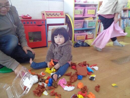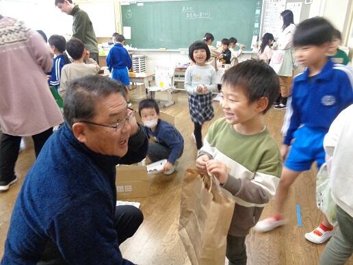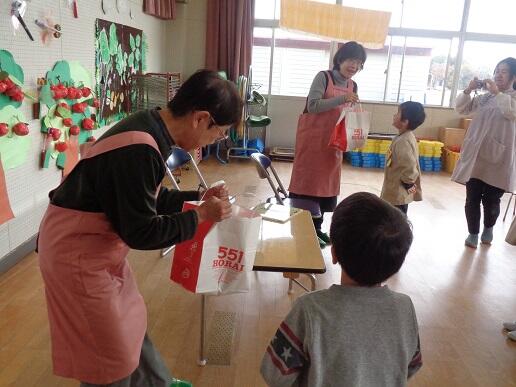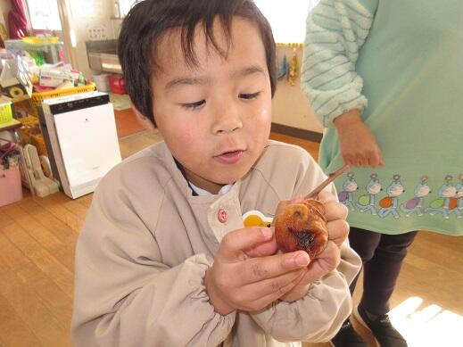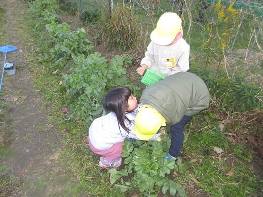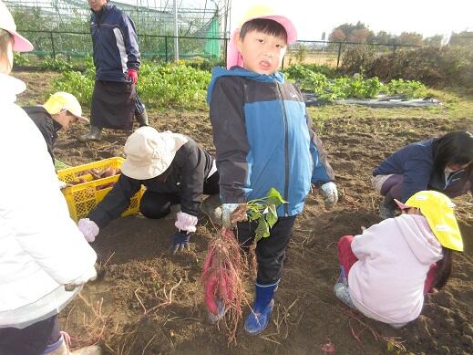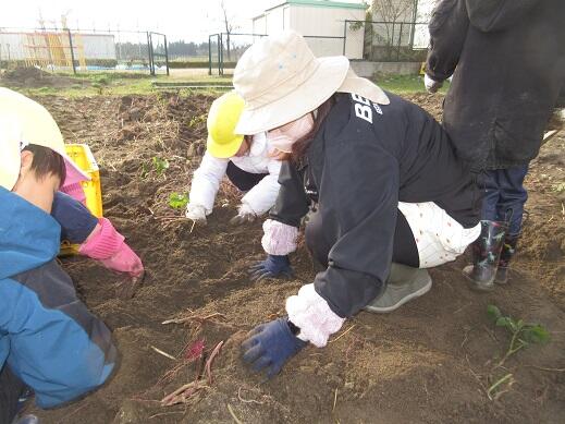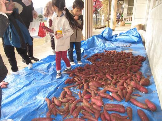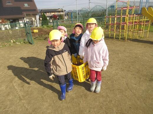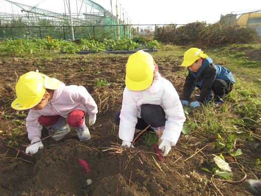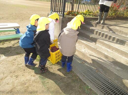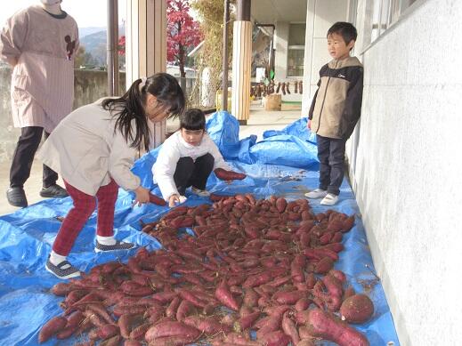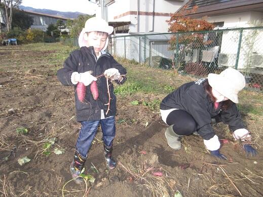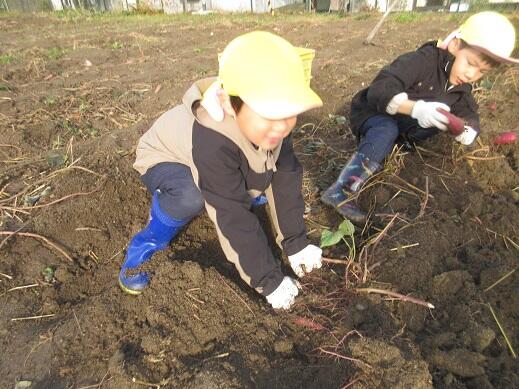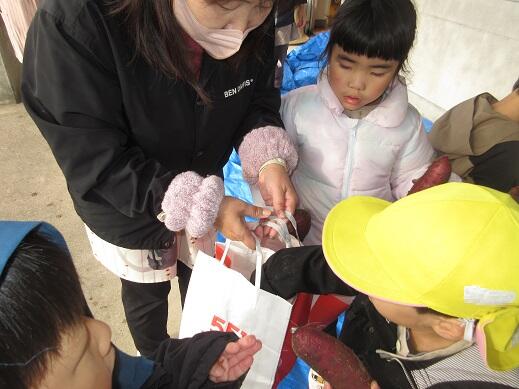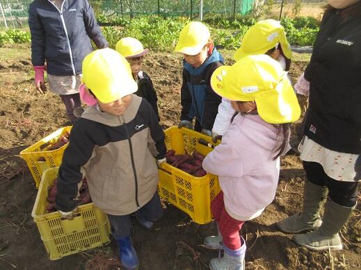 11月20日(水)3回目の芋掘りをしました。残しておいた2畝分をみんなで掘り、2箱分のサツマイモを収穫しました。お話会でお世話になっているあづま子供の本の会の方にもお土産としてあげようということになり、子ども達はサツマイモを袋に詰め、お土産の準備をしてくれました。
