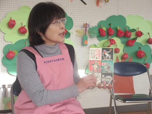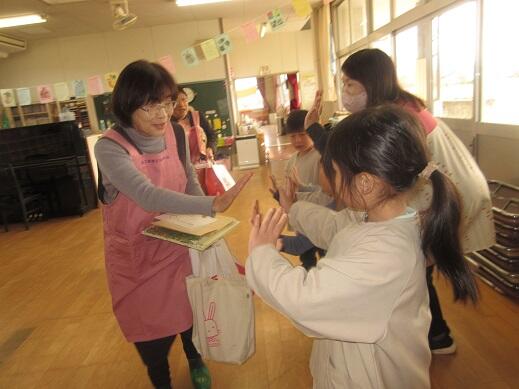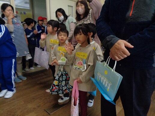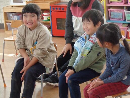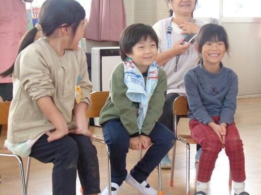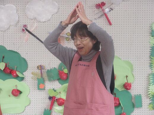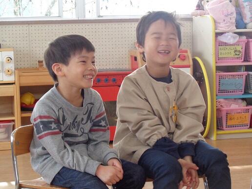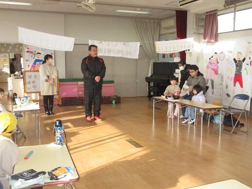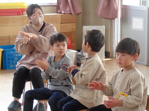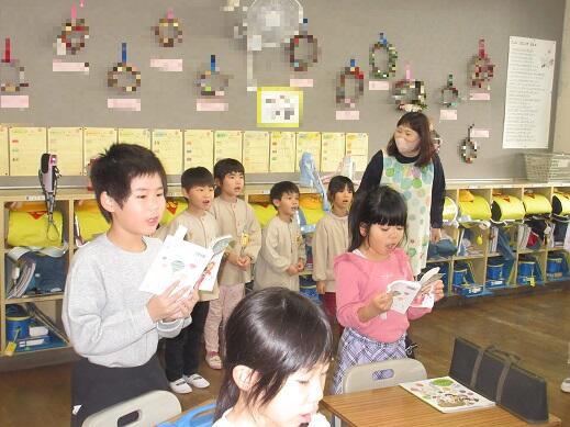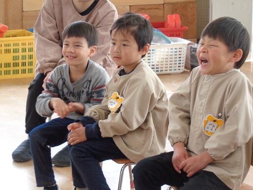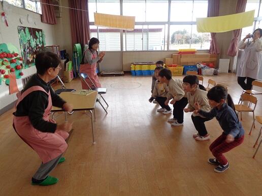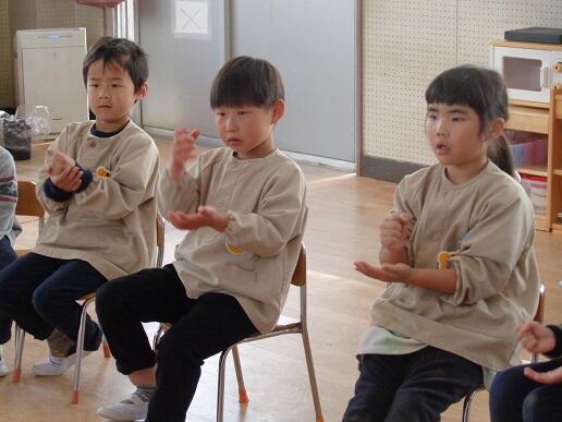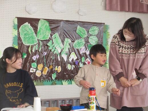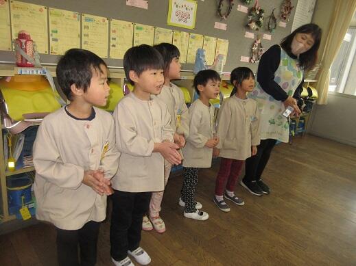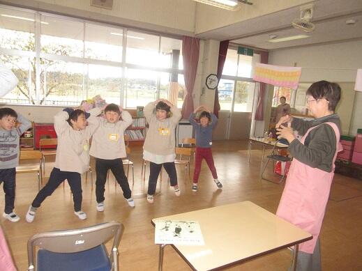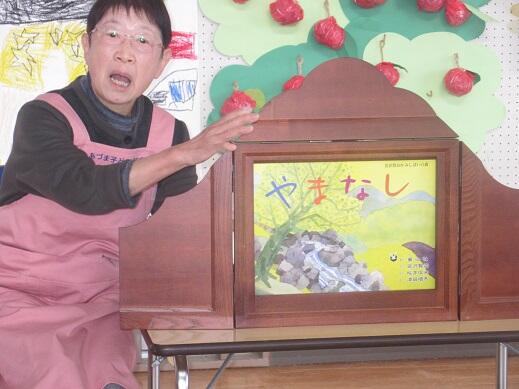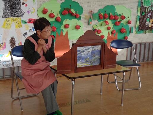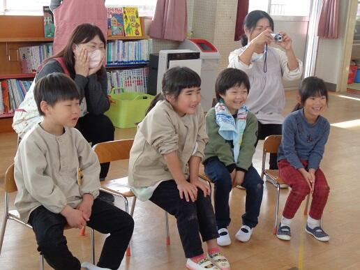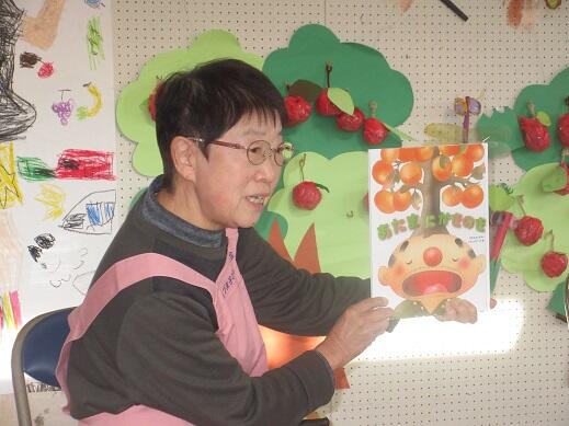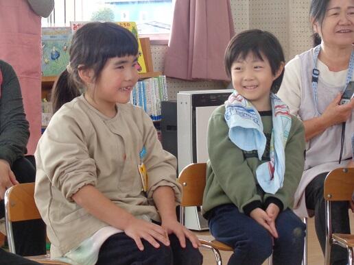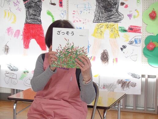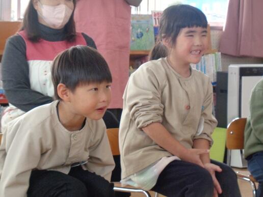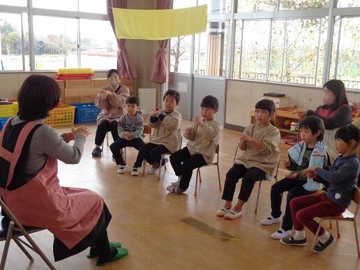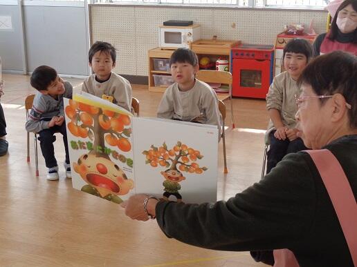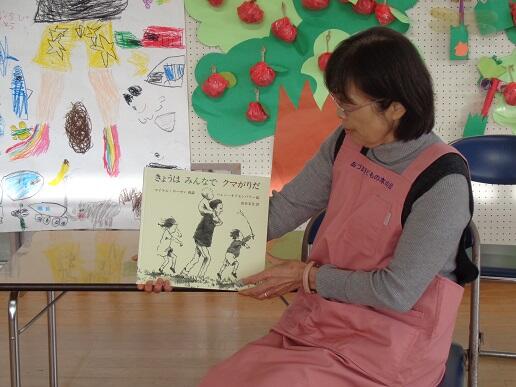 11月20日(水) あづま子どもの本の会より八巻静子さんと篠原和子さんに来ていただき、「11月の読み聞かせ」を行いました。手遊び「はじまるよったらはじまるよ」、絵本「ざっそう」「あたまにかきのき」を読んでいただきました。中間の手遊びに「ちゃちゃつぼ茶壷」をしていただき、次に、紙芝居で、長いお話である宮沢賢治の「やまなし」を読んでいただきました。川の中のカニの兄弟の幸せな日常を感じていたようです。また、絵本「きょうはみんなでクマがりだ」も読んでいただきました。最後に、手遊びで、「さよならあんころもち」をしてもらいました。年長になったこともあり、最後までじっくりと聞くことができました。本の会の皆さんありがとうございました。お礼に「キノコ」の歌とサツマイモをプレゼントしました。
