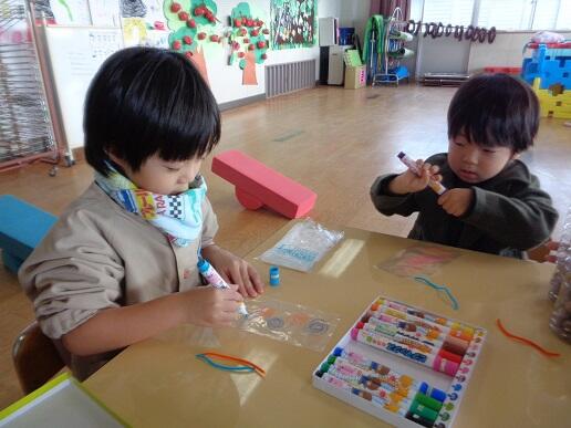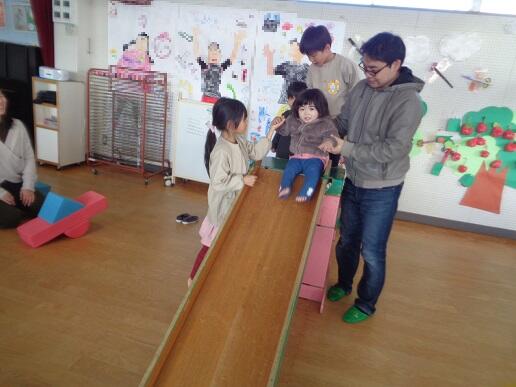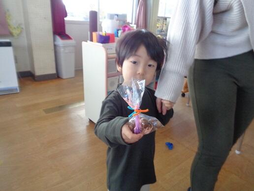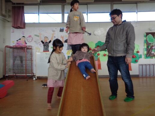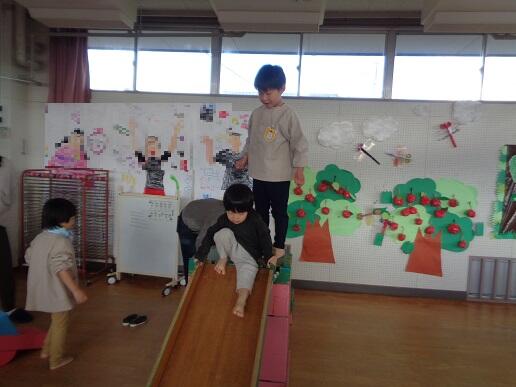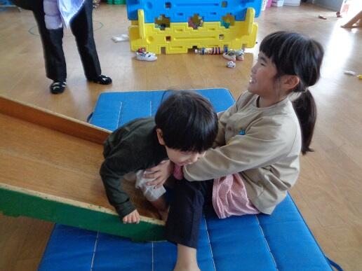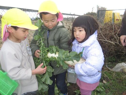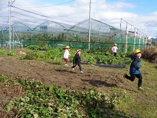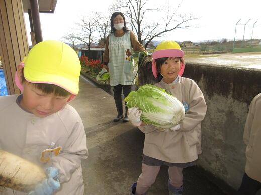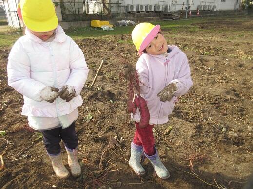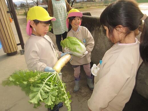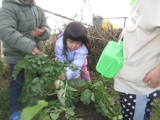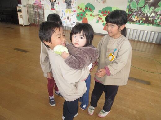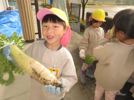 11月28日(木) 11月2回目の2・3歳児交流保育を行いました。畑で大きな大根を収穫したり、室内で滑り台やお絵描き遊びをしたりと思い思いに遊びました。子どもたちは、小さい子のお世話を懸命にしていて、ほほえましかったです。