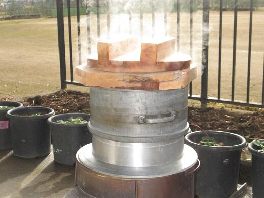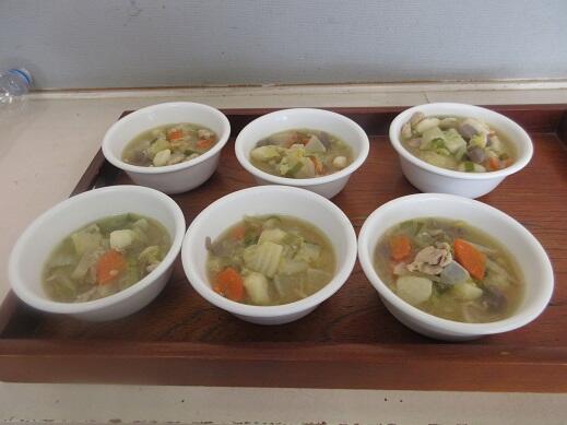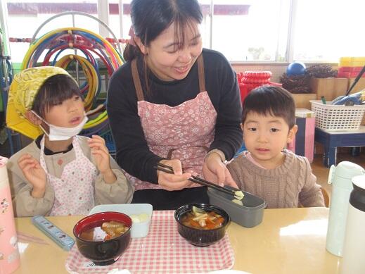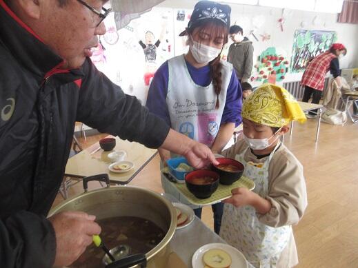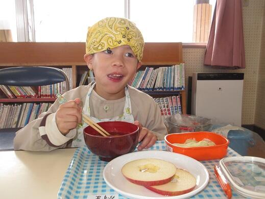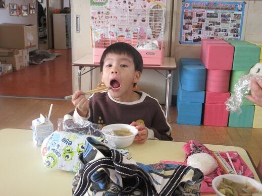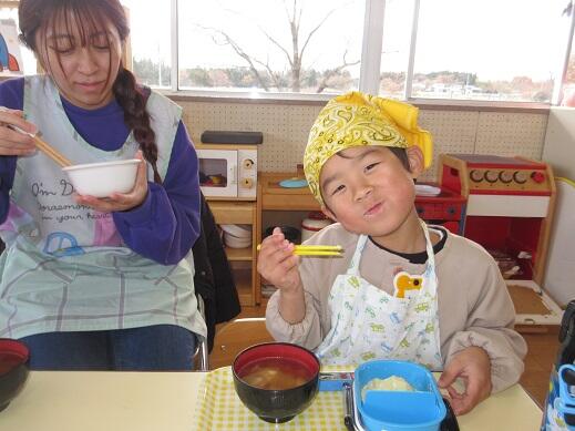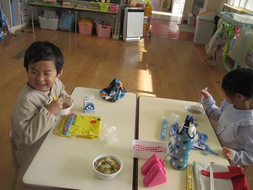 11月27日(水)今日は、幼稚園でとれた里芋、白菜、大根、ネギと昨日イオンで買い物をしてきた豚肉等を入れて芋煮を作りました。朝、子ども達が、白菜と大根、ネギを畑で収穫し職員室に届けてくれました。朝収穫した野菜はみずみずしくてとてもおいしそうです。みんな芋煮をおいしそうに食べ、お代わりをする子も見られました。