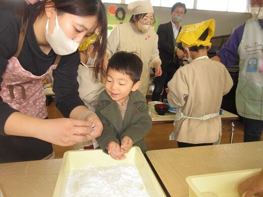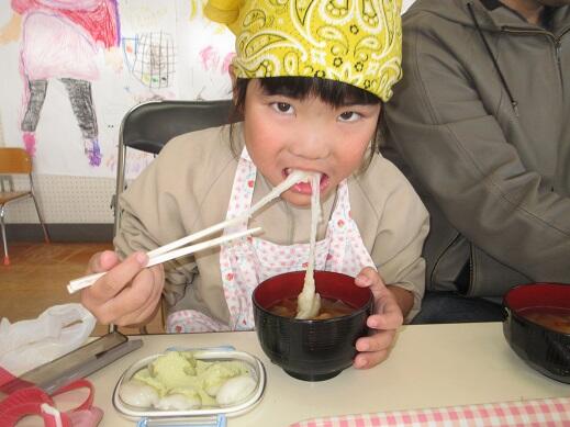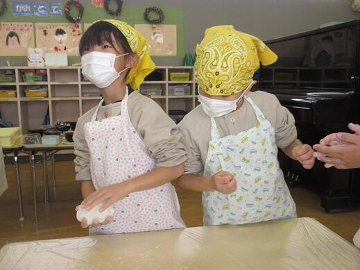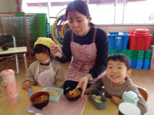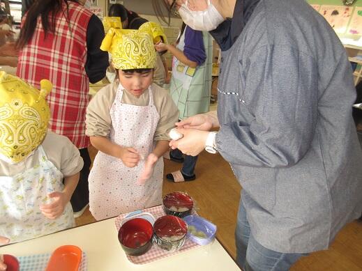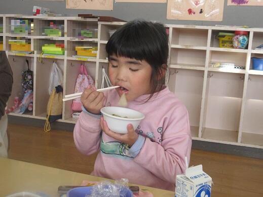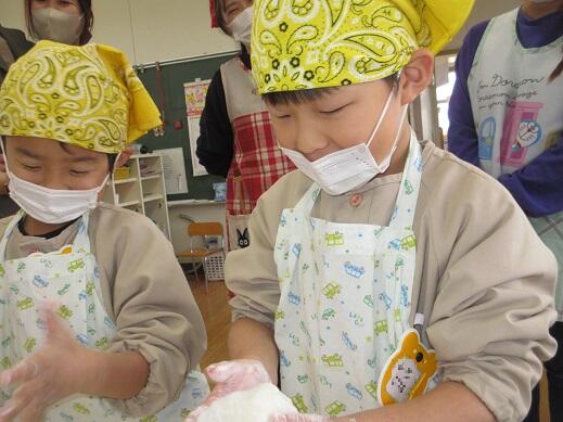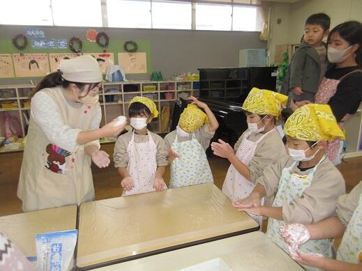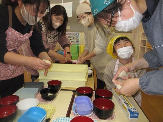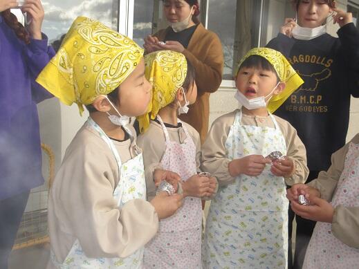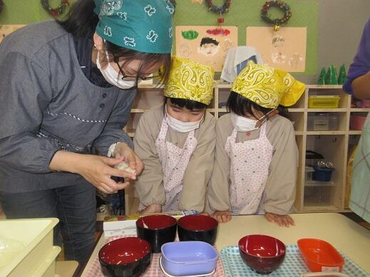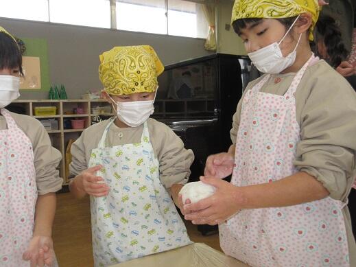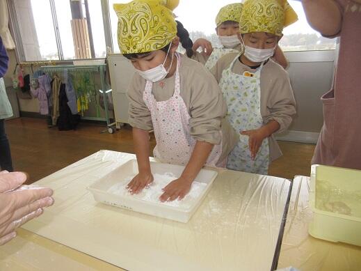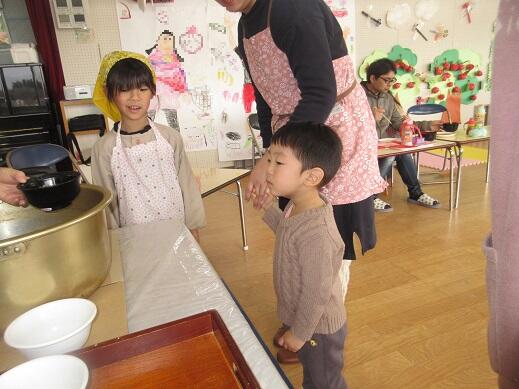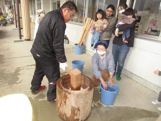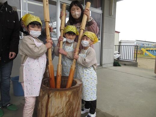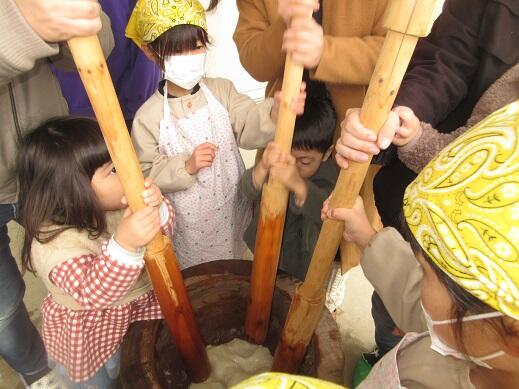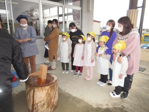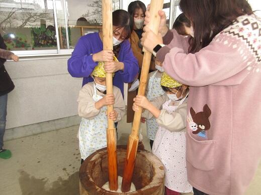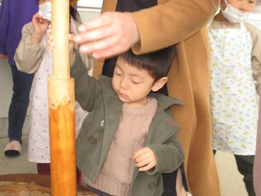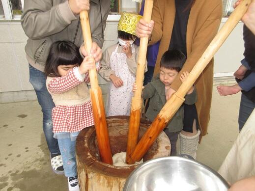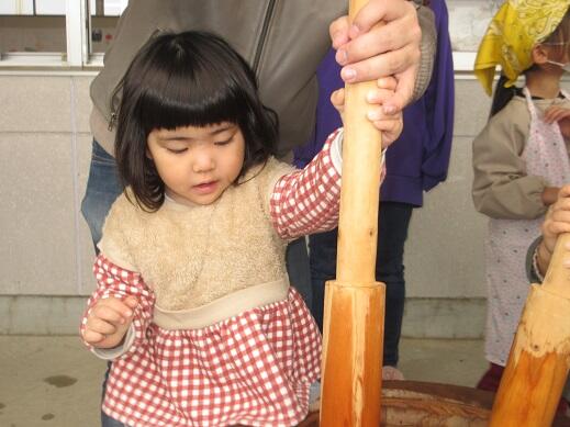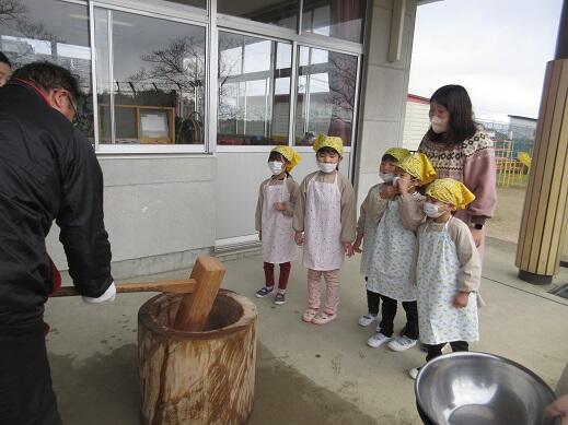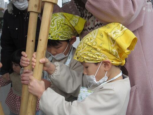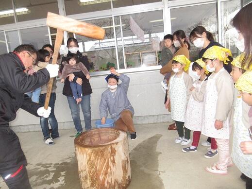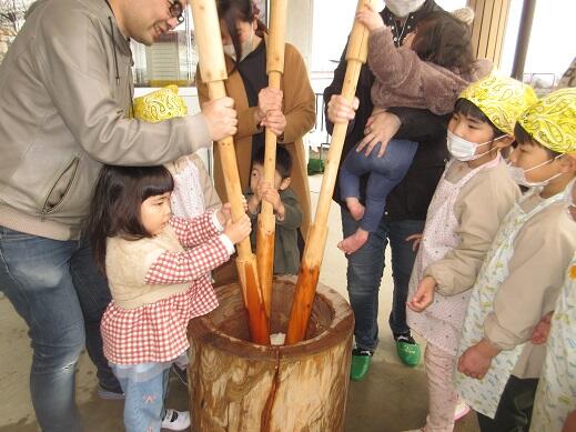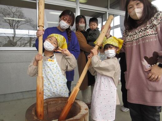 12月6日(金) もちつき会を保護者の協力で実施しました。もちつきの際は、子ども達も千本杵で参加し、おいしいお餅を完成させました。弟や妹も来園し、餅をつく経験もできました。材料の買い出しから、餅つき、餅まるめ、餅の会食と楽しくもちつき会を行うことができました。