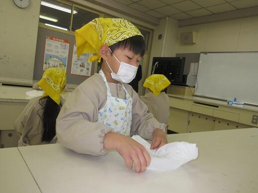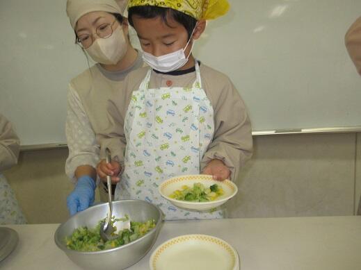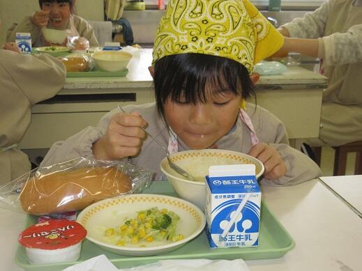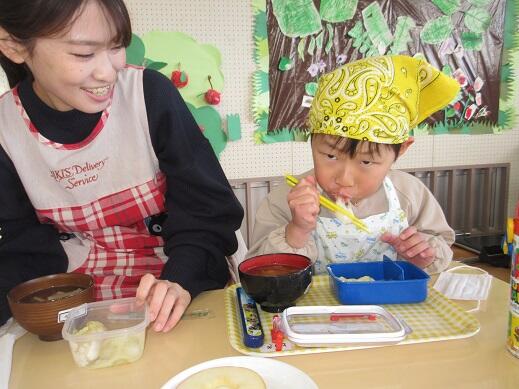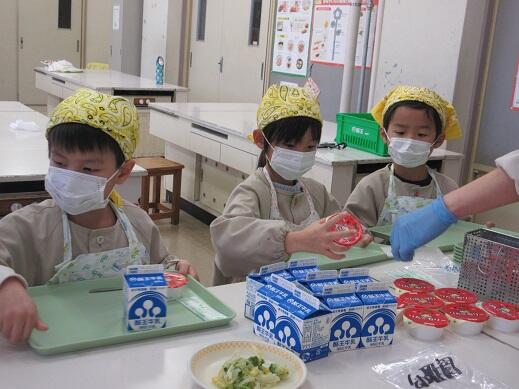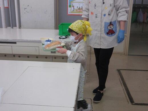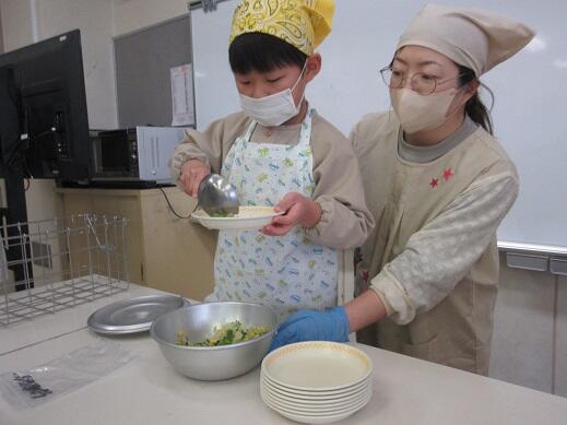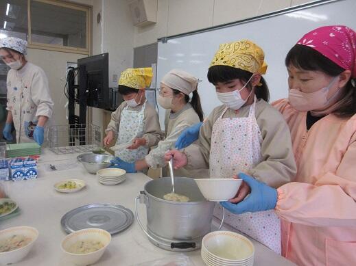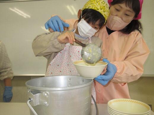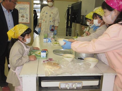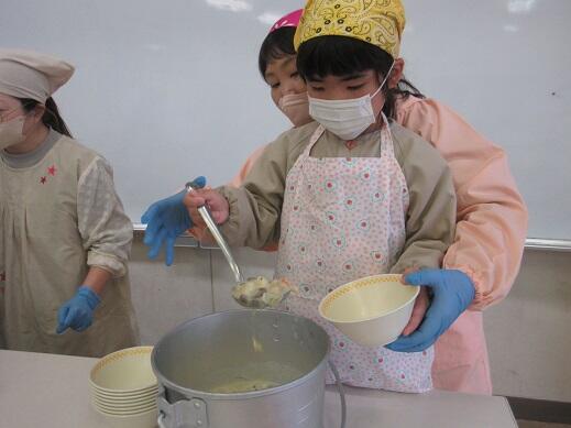 今回の給食試食会では、自分たちで配膳や片付けをがんばりました。上手によそって楽しく食べることができました。